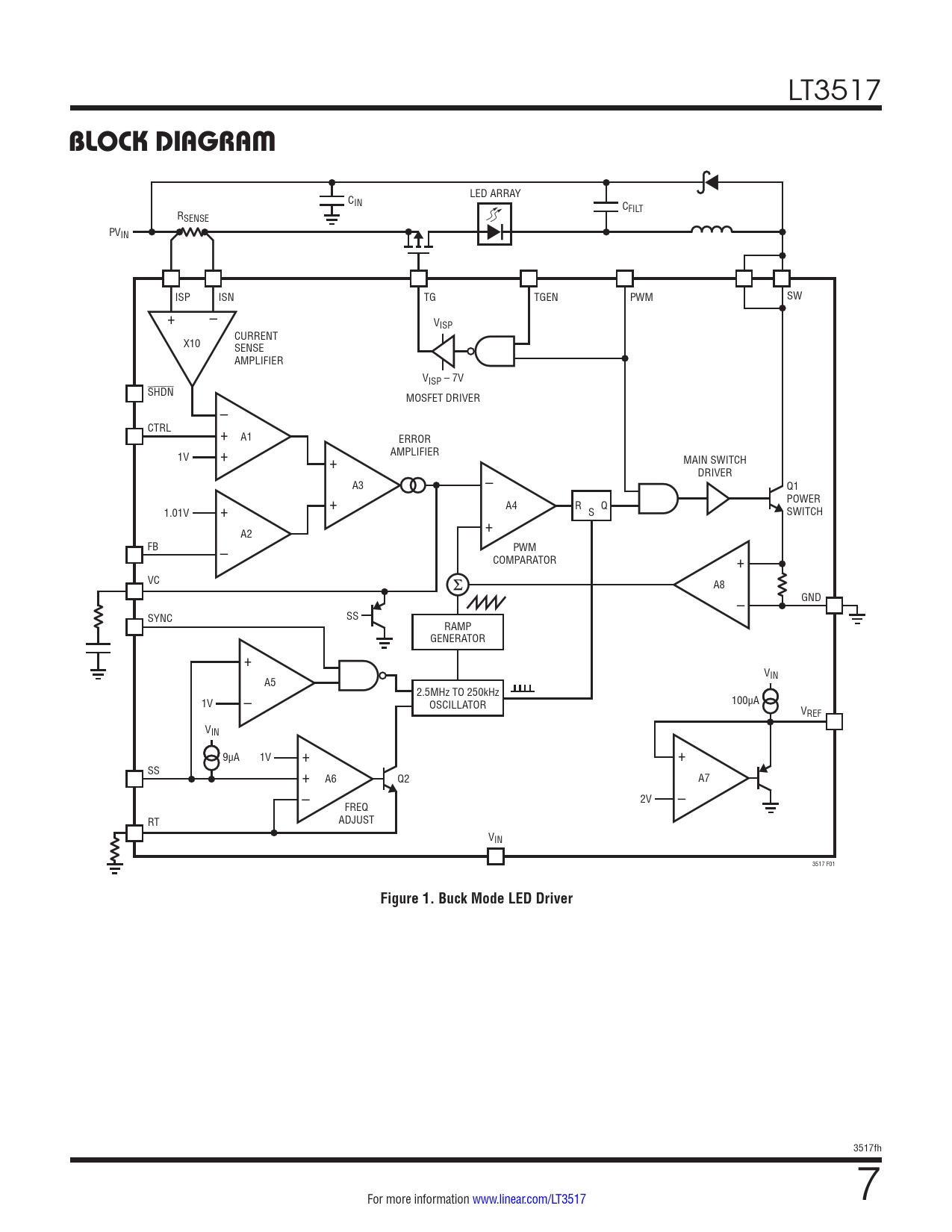 LED ARRAY CIN C R FILT SENSE PVIN ISP ISN TG TGEN PWM SW + – VISP CURRENT X10 SENSE AMPLIFIER VISP – 7V SHDN – MOSFET DRIVER CTRL + A1 + ERROR 1V AMPLIFIER + MAIN SWITCH DRIVER A3 – Q1 + POWER A4 R Q 1.01V + S SWITCH + A2 FB – PWM COMPARATOR + VC A8 – GND SYNC SS RAMP GENERATOR + VIN A5 2.5MHz TO 250kHz 1V – OSCILLATOR 100µA VREF VIN 9µA 1V + + SS + A6 Q2 A7 – 2V – FREQ RT ADJUST VIN 3517 F01