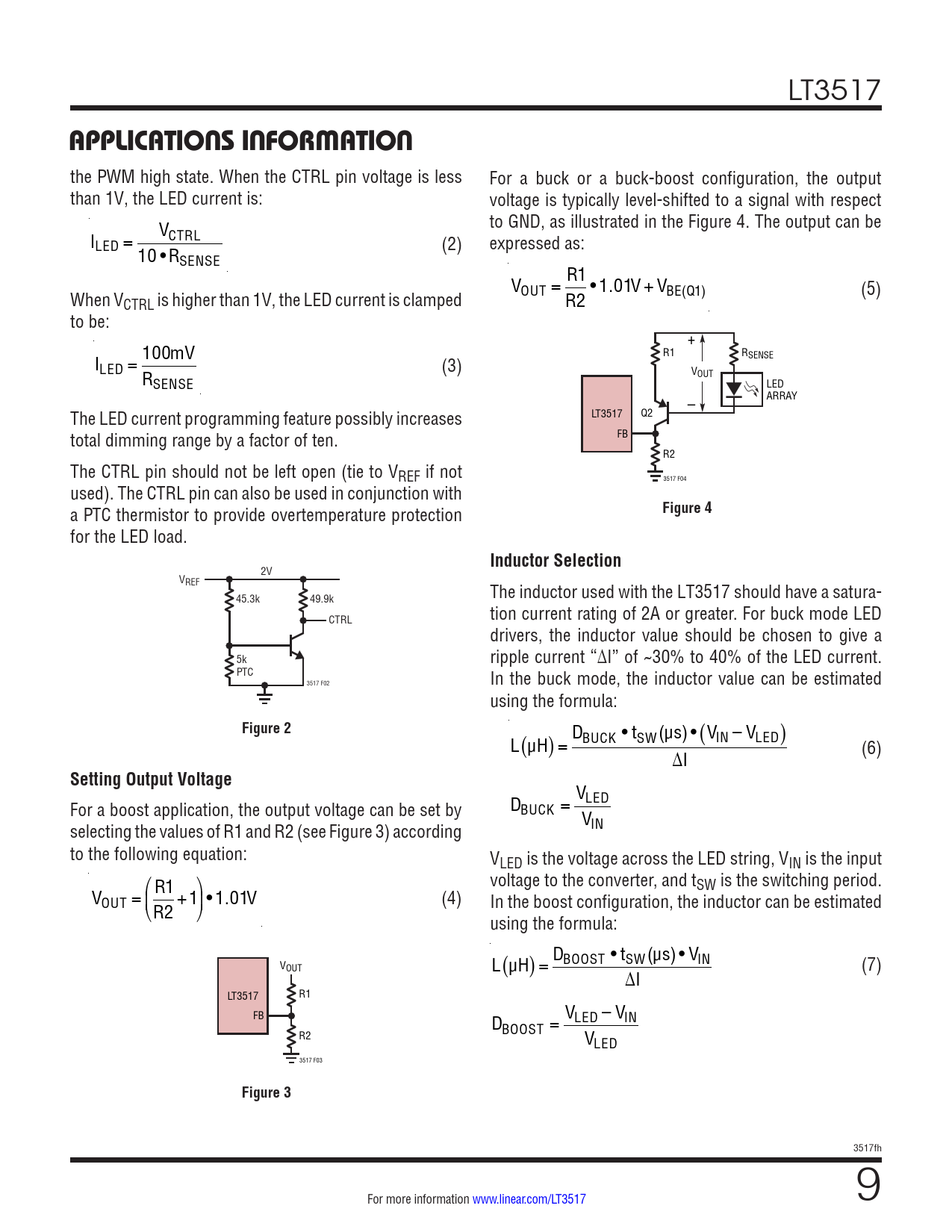 LT3517 applications inForMation the PWM high state. When the CTRL pin voltage is less For a buck or a buck-boost configuration, the output than 1V, the LED current is: voltage is typically level-shifted to a signal with respect to GND, as illustrated in the Figure 4. The output can be I VCTRL LED = (2) expressed as: 10 •R SENSE V R1 •1.01V+V When V OUT = BE(Q1) (5) CTRL is higher than 1V, the LED current is clamped R2 to be: + I 100mV R1 RSENSE LED = (3) VOUT RSENSE LED – ARRAY The LED current programming feature possibly increases LT3517 Q2 total dimming range by a factor of ten. FB R2 The CTRL pin should not be left open (tie to VREF if not 3517 F04 used). The CTRL pin can also be used in conjunction with a PTC thermistor to provide overtemperature protection Figure 4 for the LED load. Inductor Selection 2V VREF The inductor used with the LT3517 should have a satura- 45.3k 49.9k CTRL tion current rating of 2A or greater. For buck mode LED drivers, the inductor value should be chosen to give a 5k ripple current “ΔI” of ~30% to 40% of the LED current. PTC In the buck mode, the inductor value can be estimated 3517 F02 using the formula: Figure 2 D L µ ( H) ( ) = BUCK • tSW(µs) • VIN – VLED (6) ΔI Setting Output Voltage VLED For a boost application, the output voltage can be set by DBUCK = V selecting the values of R1 and R2 (see Figure 3) according IN to the following equation: VLED is the voltage across the LED string, VIN is the input voltage to the converter, and tSW is the switching period. V ⎛ R1 ⎞ OUT = ⎜ +1⎟ • 1.01V (4) In the boost configuration, the inductor can be estimated ⎝R2 ⎠ using the formula: D V BOOST • tSW (µs) • VIN OUT L µ ( H) = (7) ΔI LT3517 R1 FB D VLED – VIN BOOST = R2 VLED 3517 F03 Figure 3 3517fh For more information www.linear.com/LT3517 9 Document Outline Features Applications Typical Application Description Absolute Maximum Ratings Pin Configuration Order Information Electrical Characteristics Typical Performance Characteristics Pin Functions Block Diagram Operation Applications Information Typical Applications Package Description Revision History Related Parts