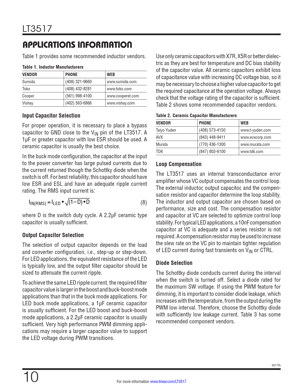 LT3517 applications inForMation Table 1 provides some recommended inductor vendors. Use only ceramic capacitors with X7R, X5R or better dielec- tric as they are best for temperature and DC bias stability Table 1. Inductor Manufacturers of the capacitor value. All ceramic capacitors exhibit loss VENDORPHONEWEB of capacitance value with increasing DC voltage bias, so it Sumida (408) 321-9660 www.sumida.com may be necessary to choose a higher value capacitor to get Toko (408) 432-8281 www.toko.com the required capacitance at the operation voltage. Always Cooper (561) 998-4100 www.cooperet.com check that the voltage rating of the capacitor is sufficient. Vishay (402) 563-6866 www.vishay.com Table 2 shows some recommended capacitor vendors. Input Capacitor SelectionTable 2. Ceramic Capacitor Manufacturers For proper operation, it is necessary to place a bypass VENDORPHONEWEB capacitor to GND close to the V Taiyo Yuden (408) 573-4150 www.t-yuden.com IN pin of the LT3517. A 1µF or greater capacitor with low ESR should be used. A AVX (843) 448-9411 www.avxcorp.com ceramic capacitor is usually the best choice. Murata (770) 436-1300 www.murata.com TDK (847) 803-6100 www.tdk.com In the buck mode configuration, the capacitor at the input to the power converter has large pulsed currents due to Loop Compensation the current returned though the Schottky diode when the switch is off. For best reliability, this capacitor should have The LT3517 uses an internal transconductance error low ESR and ESL and have an adequate ripple current amplifier whose VC output compensates the control loop. rating. The RMS input current is: The external inductor, output capacitor, and the compen- sation resistor and capacitor determine the loop stability. The inductor and output capacitor are chosen based on IIN(RMS) =ILED • (1– D) •D (8) performance, size and cost. The compensation resistor where D is the switch duty cycle. A 2.2µF ceramic type and capacitor at VC are selected to optimize control loop capacitor is usually sufficient. stability. For typical LED applications, a 10nF compensation capacitor at VC is adequate and a series resistor is not Output Capacitor Selection required. A compensation resistor may be used to increase The selection of output capacitor depends on the load the slew rate on the VC pin to maintain tighter regulation and converter configuration, i.e., step-up or step-down. of LED current during fast transients on VIN or CTRL. For LED applications, the equivalent resistance of the LED is typically low, and the output filter capacitor should be Diode Selection sized to attenuate the current ripple. The Schottky diode conducts current during the interval To achieve the same LED ripple current, the required filter when the switch is turned off. Select a diode rated for capacitor value is larger in the boost and buck-boost mode the maximum SW voltage. If using the PWM feature for applications than that in the buck mode applications. For dimming, it is important to consider diode leakage, which LED buck mode applications, a 1µF ceramic capacitor increases with the temperature, from the output during the is usually sufficient. For the LED boost and buck-boost PWM low interval. Therefore, choose the Schottky diode mode applications, a 2.2µF ceramic capacitor is usually with sufficiently low leakage current. Table 3 has some sufficient. Very high performance PWM dimming appli- recommended component vendors. cations may require a larger capacitor value to support the LED voltage during PWM transitions. 3517fh 10 For more information www.linear.com/LT3517 Document Outline Features Applications Typical Application Description Absolute Maximum Ratings Pin Configuration Order Information Electrical Characteristics Typical Performance Characteristics Pin Functions Block Diagram Operation Applications Information Typical Applications Package Description Revision History Related Parts