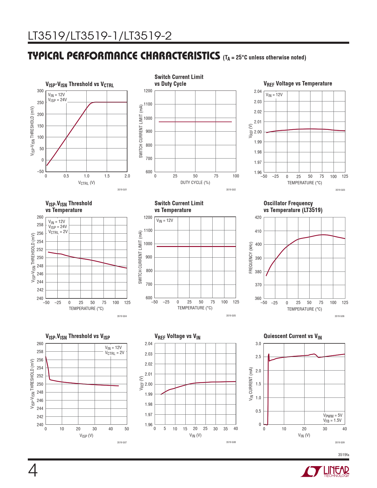 300 1200 2.04 VIN = 12V VIN = 12V V 250 ISP = 24V 2.03 1100 2.02 200 1000 2.01 150 (V) 900 2.00 REF THRESHOLD (mV) 100 V ISN 1.99 -V 800 50 ISP 1.98 V SWITCH CURRENT LIMIT (mA) 0 700 1.97 –50 600 1.96 0 0.5 1.0 1.5 2.0 0 25 50 75 100 –50 –25 0 25 50 75 100 125 VCTRL (V) DUTY CYCLE (%) TEMPERATURE (°C) 3519 G01 3519 G02 3519 G03