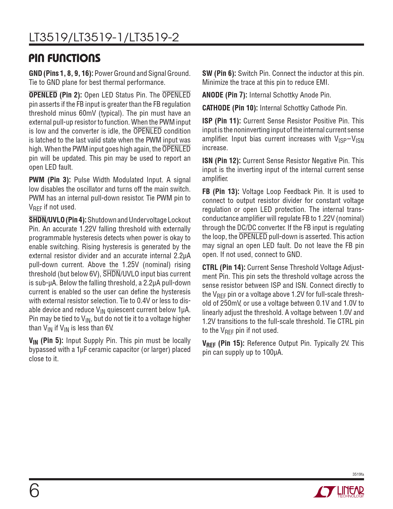 LT3519/LT3519-1/LT3519-2 PIN FUNCTIONSGND (Pins 1, 8, 9, 16): Power Ground and Signal Ground. SW (Pin 6): Switch Pin. Connect the inductor at this pin. Tie to GND plane for best thermal performance. Minimize the trace at this pin to reduce EMI. OPENLED (Pin 2): Open LED Status Pin. The OPENLED ANODE (Pin 7): Internal Schottky Anode Pin. pin asserts if the FB input is greater than the FB regulation CATHODE (Pin 10): Internal Schottky Cathode Pin. threshold minus 60mV (typical). The pin must have an external pull-up resistor to function. When the PWM input ISP (Pin 11): Current Sense Resistor Positive Pin. This is low and the converter is idle, the OPENLED condition input is the noninverting input of the internal current sense is latched to the last valid state when the PWM input was amplifi er. Input bias current increases with VISP–VISN high. When the PWM input goes high again, the OPENLED increase. pin will be updated. This pin may be used to report an ISN (Pin 12): Current Sense Resistor Negative Pin. This open LED fault. input is the inverting input of the internal current sense PWM (Pin 3): Pulse Width Modulated Input. A signal amplifi er. low disables the oscillator and turns off the main switch. FB (Pin 13): Voltage Loop Feedback Pin. It is used to PWM has an internal pull-down resistor. Tie PWM pin to connect to output resistor divider for constant voltage VREF if not used. regulation or open LED protection. The internal trans- SHDN/UVLO (Pin 4): Shutdown and Undervoltage Lockout conductance amplifi er will regulate FB to 1.22V (nominal) Pin. An accurate 1.22V falling threshold with externally through the DC/DC converter. If the FB input is regulating programmable hysteresis detects when power is okay to the loop, the OPENLED pull-down is asserted. This action enable switching. Rising hysteresis is generated by the may signal an open LED fault. Do not leave the FB pin external resistor divider and an accurate internal 2.2μA open. If not used, connect to GND. pull-down current. Above the 1.25V (nominal) rising CTRL (Pin 14): Current Sense Threshold Voltage Adjust- threshold (but below 6V), SHDN/UVLO input bias current ment Pin. This pin sets the threshold voltage across the is sub-μA. Below the falling threshold, a 2.2μA pull-down sense resistor between ISP and ISN. Connect directly to current is enabled so the user can defi ne the hysteresis the VREF pin or a voltage above 1.2V for full-scale thresh- with external resistor selection. Tie to 0.4V or less to dis- old of 250mV, or use a voltage between 0.1V and 1.0V to able device and reduce VIN quiescent current below 1μA. linearly adjust the threshold. A voltage between 1.0V and Pin may be tied to VIN, but do not tie it to a voltage higher 1.2V transitions to the full-scale threshold. Tie CTRL pin than VIN if VIN is less than 6V. to the VREF pin if not used. VIN (Pin 5): Input Supply Pin. This pin must be locally VREF (Pin 15): Reference Output Pin. Typically 2V. This bypassed with a 1μF ceramic capacitor (or larger) placed pin can supply up to 100μA. close to it. 3519fa 6