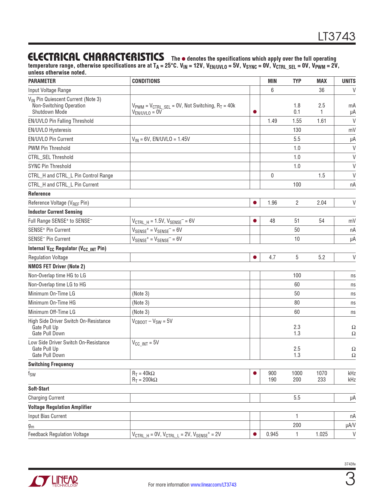 Input Bias Current 1 nA gm 200 µA/V Feedback Regulation Voltage V + CTRL_H = 0V, VCTRL_L = 2V, VSENSE = 2V l 0.945 1 1.025 V 3743fe For more information www.linear.com/LT3743 3 Document Outline Features Applications Description Typical Application Absolute Maximum Ratings Pin Configuration Order Information Electrical Characteristics Typical Performance Characteristics Pin Functions Block Diagram Operation Applications Information Typical Applications Package Description Revision History Typical Application Related Parts Features Applications Typical Application Description Absolute Maximum Ratings Pin Configuration Order Information Electrical Characteristics Typical Performance Characteristics Pin Functions Block Diagram Operation Applications Information Typical Applications Package Description Revision History Typical Application Related Parts