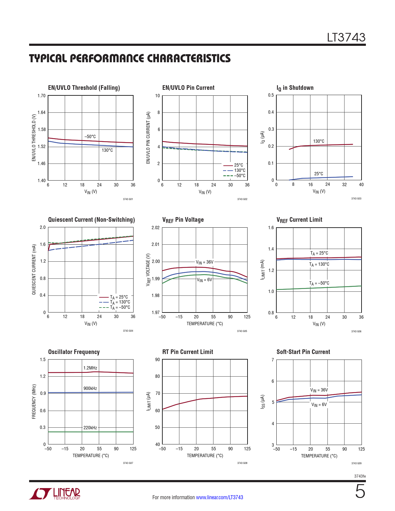 1.70 10 0.5 1.64 8 0.4 1.58 6 0.3 –50°C (µA) I Q 130°C 1.52 4 0.2 130°C EN/UVLO THRESHOLD (V) 1.46 EN/UVLO PIN CURRENT (µA) 2 25°C 0.1 130°C –50°C 25°C 1.40 0 0 6 12 18 24 30 36 6 12 18 24 30 36 0 8 16 24 32 40 VIN (V) VIN (V) VIN (V) 3743 G01 3743 G02 3743 G03