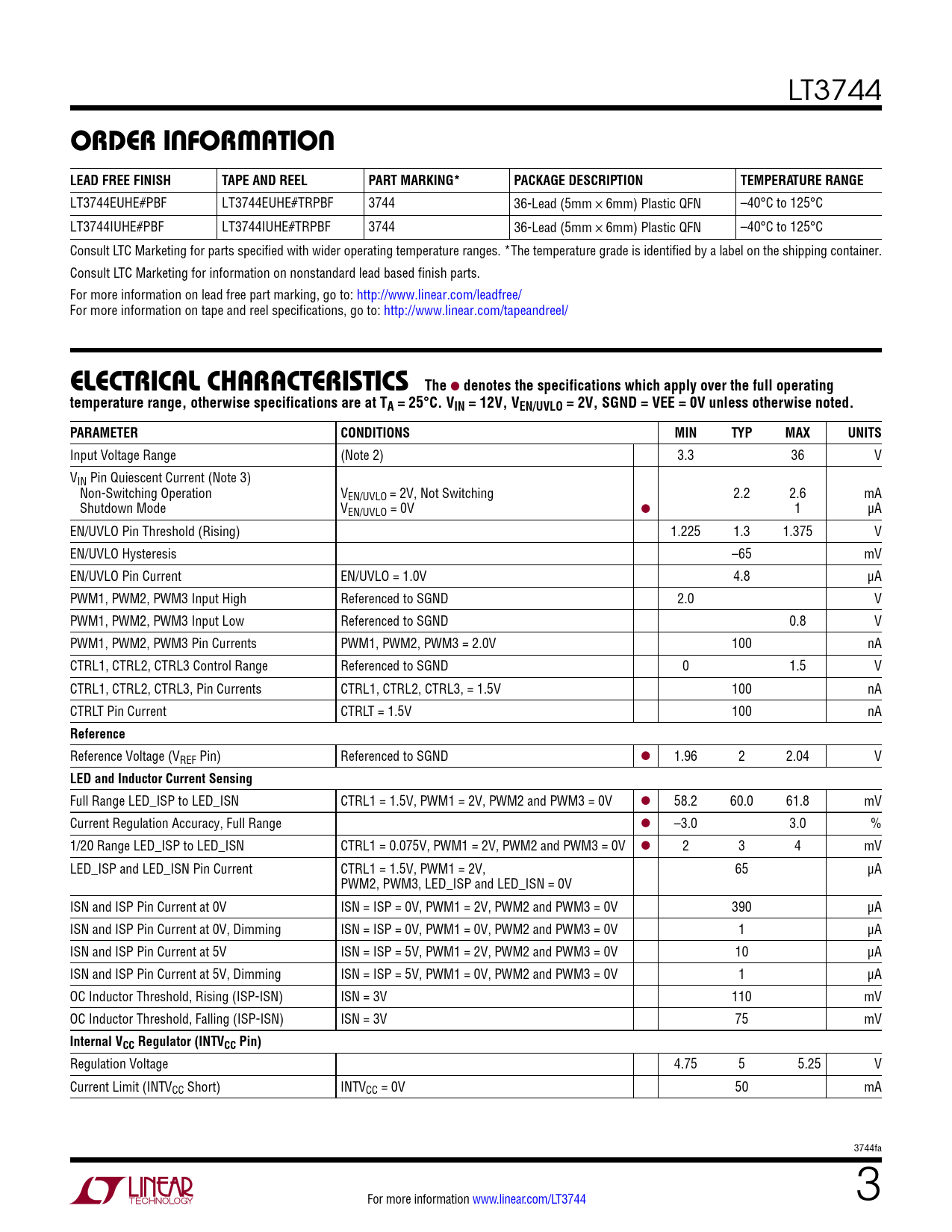 LT3744EUHE#PBF LT3744EUHE#TRPBF 3744 36-Lead (5mm × 6mm) Plastic QFN –40°C to 125°C LT3744IUHE#PBF LT3744IUHE#TRPBF 3744 36-Lead (5mm × 6mm) Plastic QFN –40°C to 125°C Consult LTC Marketing for parts specified with wider operating temperature ranges. *The temperature grade is identified by a label on the shipping container. Consult LTC Marketing for information on nonstandard lead based finish parts. For more information on lead free part marking, go to: http://www.linear.com/leadfree/ For more information on tape and reel specifications, go to: http://www.linear.com/tapeandreel/