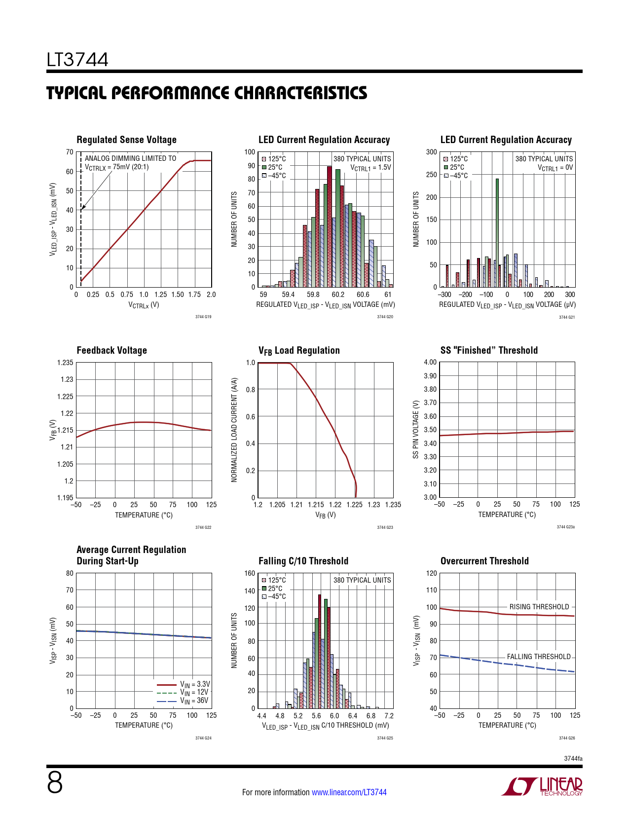 80 160 120 125°C 380 TYPICAL UNITS 70 140 25°C 110 –45°C 60 120 100 RISING THRESHOLD 50 100 90 (mV) (mV) 40 80 80 -V ISN V ISN - FALLING THRESHOLD V ISP 30 60 70 NUMBER OF UNITS V ISP 20 40 60 VIN = 3.3V 10 VIN = 12V 20 50 VIN = 36V 0 0 40 –50 –25 0 25 50 75 100 125 4.4 4.8 5.2 5.6 6.0 6.4 6.8 7.2 –50 –25 0 25 50 75 100 125 TEMPERATURE (°C) VLED_ISP - VLED_ISN C/10 THRESHOLD (mV) TEMPERATURE (°C) 3744 G24 3744 G25 3744 G26 3744fa 8 For more information www.linear.com/LT3744 Document Outline Features Applications Description Typical Application Absolute Maximum Ratings Pin Configuration Order Information Electrical Characteristics Typical Performance Characteristics Pin Functions Block Diagram Operation Applications Information Typical Applications Package Description Typical Application Related Parts