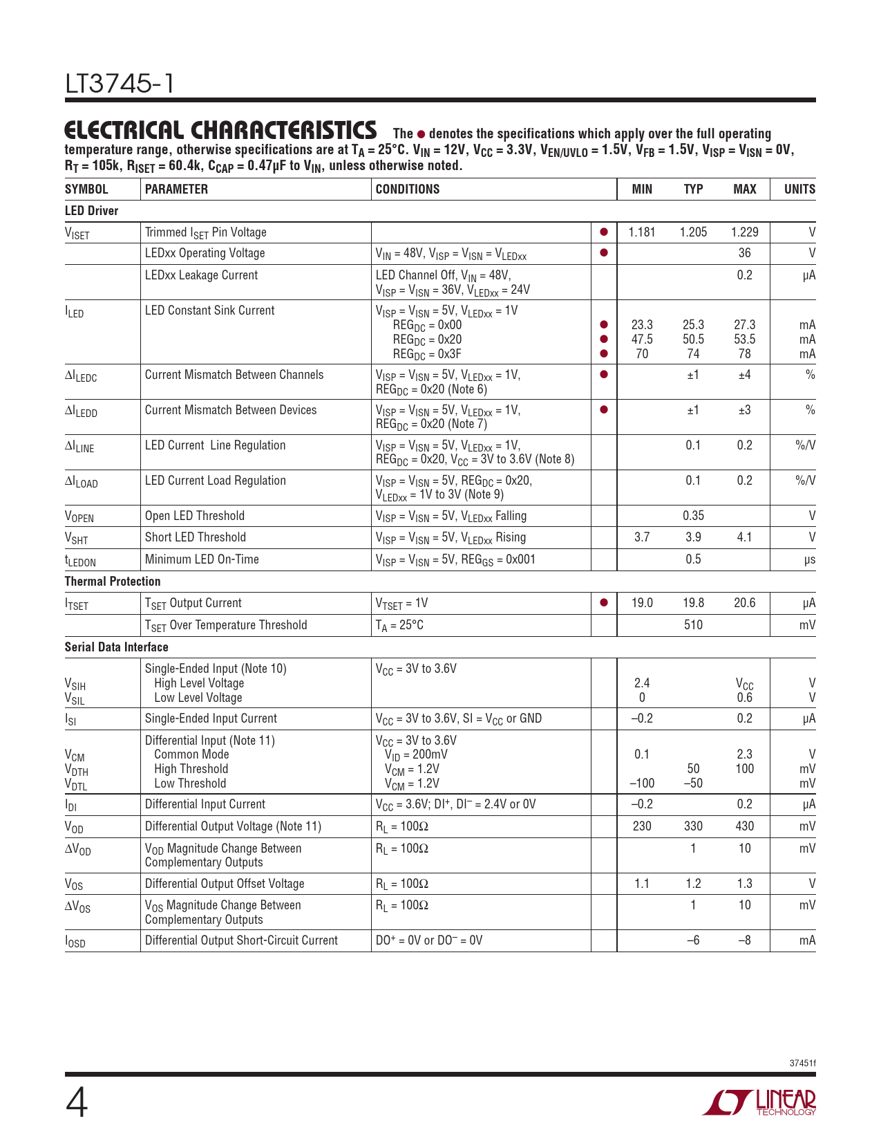 VISET Trimmed ISET Pin Voltage l 1.181 1.205 1.229 V LEDxx Operating Voltage VIN = 48V, VISP = VISN = VLEDxx l 36 V LEDxx Leakage Current LED Channel Off, VIN = 48V, 0.2 µA VISP = VISN = 36V, VLEDxx = 24V ILED LED Constant Sink Current VISP = VISN = 5V, VLEDxx = 1V REGDC = 0x00 l 23.3 25.3 27.3 mA REGDC = 0x20 l 47.5 50.5 53.5 mA REGDC = 0x3F l 70 74 78 mA ∆ILEDC Current Mismatch Between Channels VISP = VISN = 5V, VLEDxx = 1V, l ±1 ±4 % REGDC = 0x20 (Note 6) ∆ILEDD Current Mismatch Between Devices VISP = VISN = 5V, VLEDxx = 1V, l ±1 ±3 % REGDC = 0x20 (Note 7) ∆ILINE LED Current Line Regulation VISP = VISN = 5V, VLEDxx = 1V, 0.1 0.2 %/V REGDC = 0x20, VCC = 3V to 3.6V (Note 8) ∆ILOAD LED Current Load Regulation VISP = VISN = 5V, REGDC = 0x20, 0.1 0.2 %/V VLEDxx = 1V to 3V (Note 9) VOPEN Open LED Threshold VISP = VISN = 5V, VLEDxx Falling 0.35 V VSHT Short LED Threshold VISP = VISN = 5V, VLEDxx Rising 3.7 3.9 4.1 V tLEDON Minimum LED On-Time VISP = VISN = 5V, REGGS = 0x001 0.5 µs