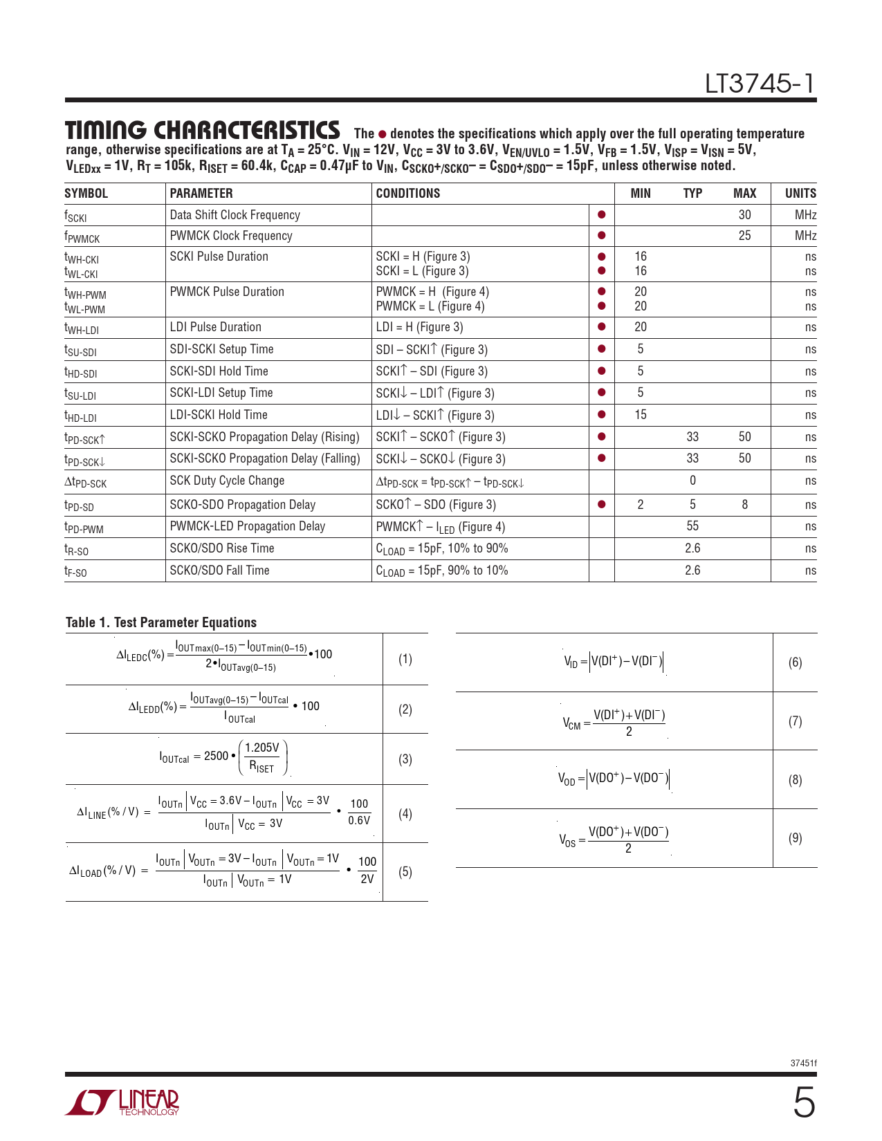 fSCKI Data Shift Clock Frequency l 30 MHz fPWMCK PWMCK Clock Frequency l 25 MHz tWH-CKI SCKI Pulse Duration SCKI = H (Figure 3) l 16 ns tWL-CKI SCKI = L (Figure 3) l 16 ns tWH-PWM PWMCK Pulse Duration PWMCK = H (Figure 4) l 20 ns tWL-PWM PWMCK = L (Figure 4) l 20 ns tWH-LDI LDI Pulse Duration LDI = H (Figure 3) l 20 ns tSU-SDI SDI-SCKI Setup Time SDI – SCKI↑ (Figure 3) l 5 ns tHD-SDI SCKI-SDI Hold Time SCKI↑ – SDI (Figure 3) l 5 ns tSU-LDI SCKI-LDI Setup Time SCKI↓ – LDI↑ (Figure 3) l 5 ns tHD-LDI LDI-SCKI Hold Time LDI↓ – SCKI↑ (Figure 3) l 15 ns tPD-SCK↑ SCKI-SCKO Propagation Delay (Rising) SCKI↑ – SCKO↑ (Figure 3) l 33 50 ns tPD-SCK↓ SCKI-SCKO Propagation Delay (Falling) SCKI↓ – SCKO↓ (Figure 3) l 33 50 ns ∆tPD-SCK SCK Duty Cycle Change ∆tPD-SCK = tPD-SCK↑ – tPD-SCK↓ 0 ns tPD-SD SCKO-SDO Propagation Delay SCKO↑ – SDO (Figure 3) l 2 5 8 ns tPD-PWM PWMCK-LED Propagation Delay PWMCK↑ – ILED (Figure 4) 55 ns tR-SO SCKO/SDO Rise Time CLOAD = 15pF, 10% to 90% 2.6 ns tF-SO SCKO/SDO Fall Time CLOAD = 15pF, 90% to 10% 2.6 ns