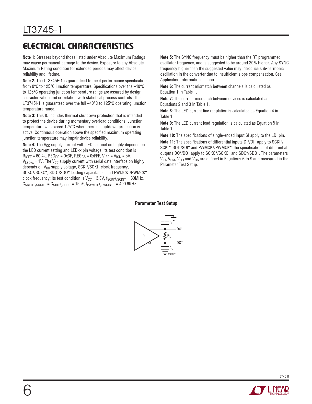 LT3745-1 ELECTRICAL CHARACTERISTICS Note 1: Stresses beyond those listed under Absolute Maximum Ratings Note 5: The SYNC frequency must be higher than the RT programmed may cause permanent damage to the device. Exposure to any Absolute oscillator frequency, and is suggested to be around 20% higher. Any SYNC Maximum Rating condition for extended periods may affect device frequency higher than the suggested value may introduce sub-harmonic reliability and lifetime. oscillation in the converter due to insufficient slope compensation. See Note 2: The LT3745E-1 is guaranteed to meet performance specifications Application Information section. from 0°C to 125°C junction temperature. Specifications over the –40°C Note 6: The current mismatch between channels is calculated as to 125°C operating junction temperature range are assured by design, Equation 1 in Table 1. characterization and correlation with statistical process controls. The Note 7: The current mismatch between devices is calculated as LT3745I-1 is guaranteed over the full –40°C to 125°C operating junction Equations 2 and 3 in Table 1. temperature range. Note 8: The LED current line regulation is calculated as Equation 4 in Note 3: This IC includes thermal shutdown protection that is intended Table 1. to protect the device during momentary overload conditions. Junction Note 9: The LED current load regulation is calculated as Equation 5 in temperature will exceed 125°C when thermal shutdown protection is Table 1. active. Continuous operation above the specified maximum operating junction temperature may impair device reliability. Note 10: The specifications of single-ended input SI apply to the LDI pin. Note 4: The V Note 11: The specifications of differential inputs DI+/DI– apply to SCKI+/ CC supply current with LED channel on highly depends on the LED current setting and LEDxx pin voltage; its test condition is SCKI–, SDI+/SDI– and PWMCK+/PWMCK–; the specifications of differential R outputs DO+/DO– apply to SCKO+/SCKO– and SDO+/SDO–. The parameters ISET = 60.4k, REGDC = 0x3F, REGGS = 0xFFF, VISP = VISN = 5V, V VID, VCM, VOD and VOS are defined in Equations 6 to 9 and measured in the LEDxx = 1V. The VCC supply current with serial data interface on highly depends on V Parameter Test Setup. CC supply voltage, SCKI+/SCKI– clock frequency, SCKO+/SCKO–, SDO+/SDO– loading capacitance, and PWMCK+/PWMCK– clock frequency; its test condition is VCC = 3.3V, fSCKI+/SCKI– = 30MHz, CSCKO+/SCKO– = CSDO+/SDO– = 15pF, fPWMCK+/PWMCK– = 409.6KHz. Parameter Test Setup CL DO+ D RL DO– CL 37451 PT 37451f 6 Document Outline Features Applications Description Typical Application Absolute Maximum Ratings Pin Configuration Order Information Electrical Characteristics Timing Characteristics Typical Performance Characteristics Pin Functions Block Diagram Operation Applications Information Typical Application Package Description Typical Application Related Parts