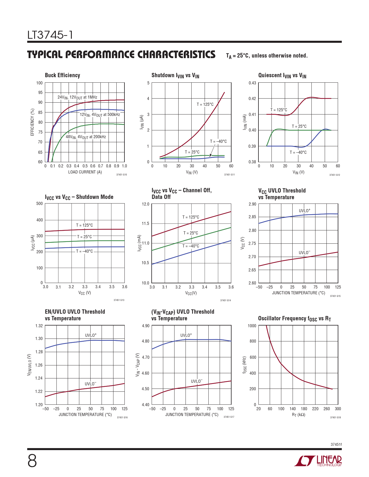 500 12.0 2.90 UVLO+ T = 125°C 2.85 400 T = 125°C 11.5 2.80 T = 25°C 300 T = 25°C (µA) (mA) 11.0 (V) 2.75 T = –40°C I VCC V CC 200 T = –40°C I VCC UVLO– 2.70 10.5 100 2.65 0 10.0 2.60 3.0 3.1 3.2 3.3 3.4 3.5 3.6 3.0 3.1 3.2 3.3 3.4 3.5 3.6 –50 –25 0 25 50 75 100 125 VCC (V) VCC(V) JUNCTION TEMPERATURE (°C) 37451 G15 37451 G13 37451 G14