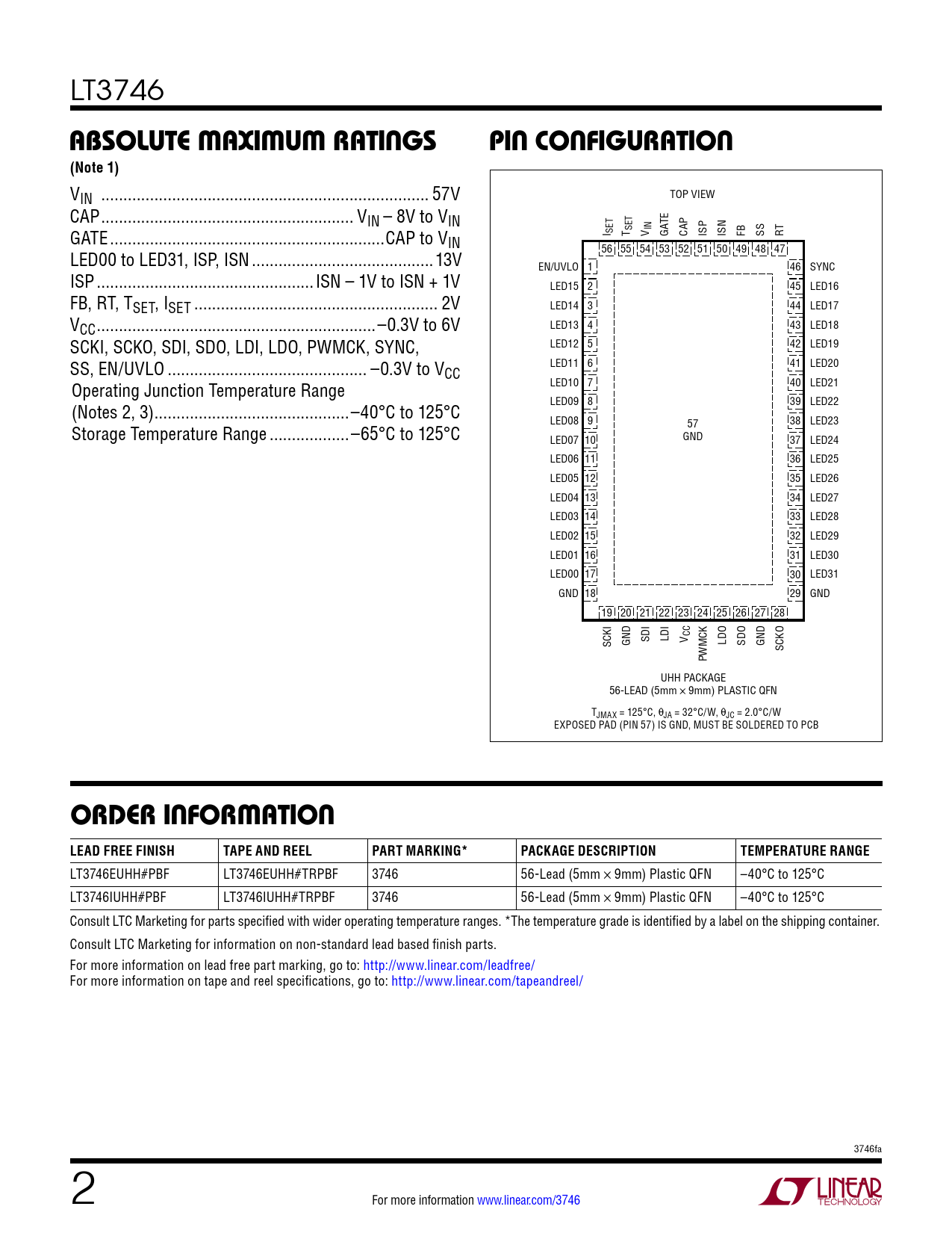 LT3746EUHH#PBF LT3746EUHH#TRPBF 3746 56-Lead (5mm × 9mm) Plastic QFN –40°C to 125°C LT3746IUHH#PBF LT3746IUHH#TRPBF 3746 56-Lead (5mm × 9mm) Plastic QFN –40°C to 125°C Consult LTC Marketing for parts specified with wider operating temperature ranges. *The temperature grade is identified by a label on the shipping container. Consult LTC Marketing for information on non-standard lead based finish parts. For more information on lead free part marking, go to: http:/ www.linear.com/leadfree/ For more information on tape and reel specifications, go to: http://www.linear.com/tapeandreel/ 3746fa 2 For more information www.linear.com/3746 Document Outline Description Typical Application Absolute Maximum Ratings Pin Configuration Electrical Characteristics Pin Functions Block Diagram Applications Information Typical Application Related Parts