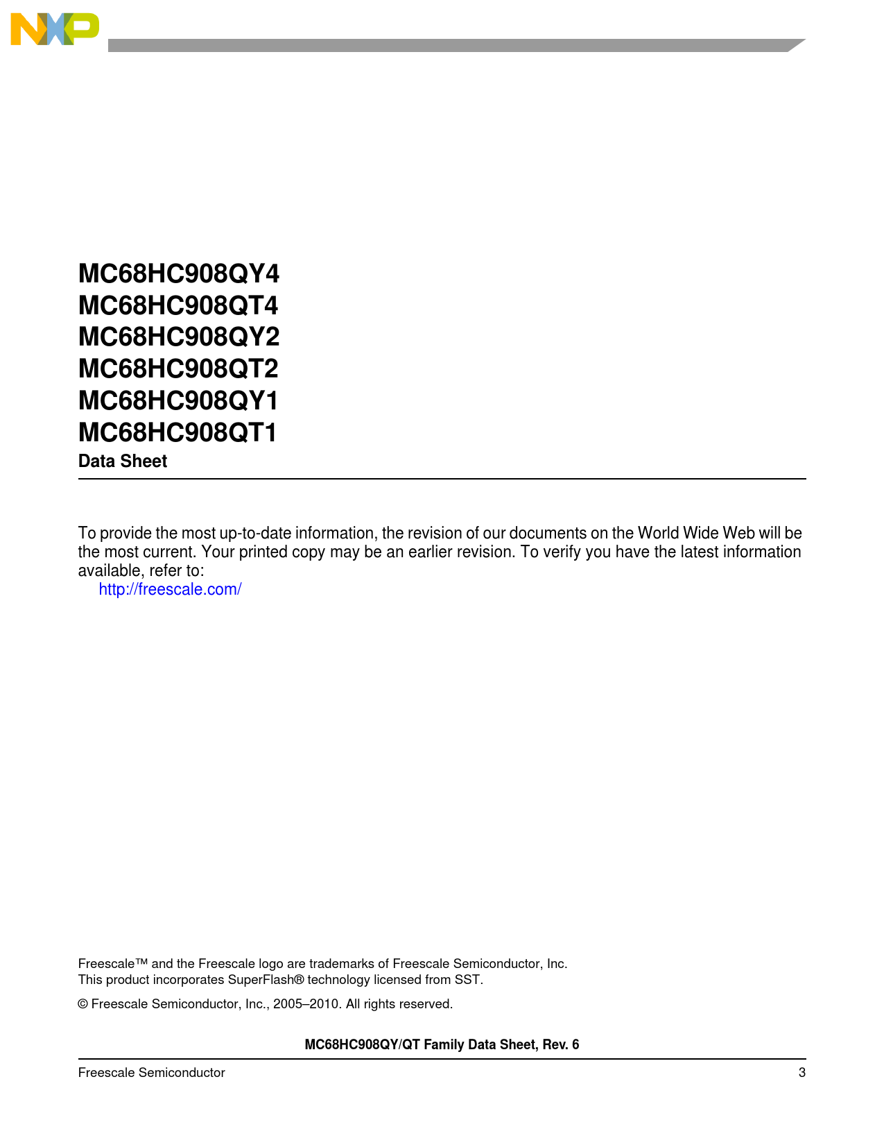 To provide the most up-to-date information, the revision of our documents on the World Wide Web will be the most current. Your printed copy may be an earlier revision. To verify you have the latest information available, refer to: http://freescale.com/ Freescale™ and the Freescale logo are trademarks of Freescale Semiconductor, Inc. This product incorporates SuperFlash® technology licensed from SST. © Freescale Semiconductor, Inc., 2005–2010. All rights reserved.