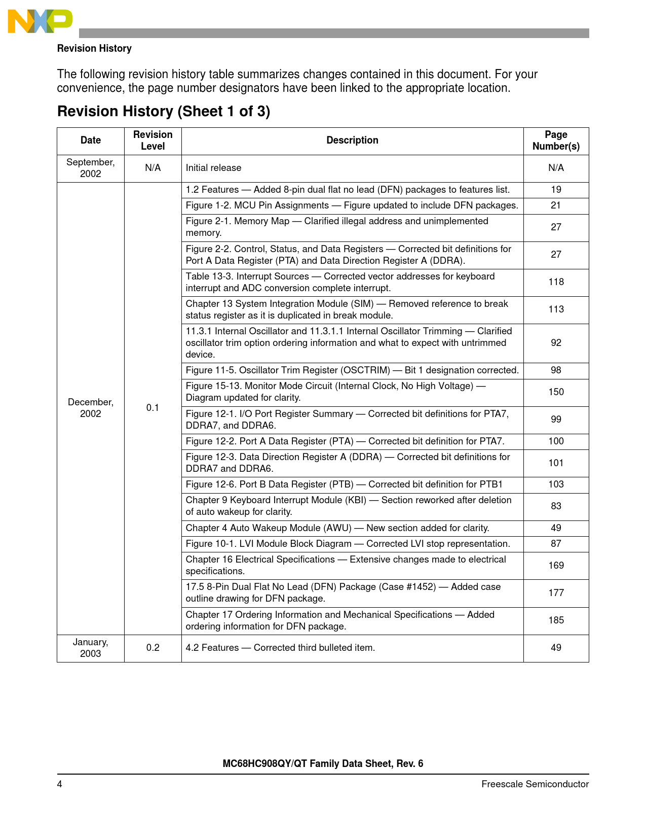 September, N/A Initial release N/A 2002 1.2 Features — Added 8-pin dual flat no lead (DFN) packages to features list. 19 Figure 1-2. MCU Pin Assignments — Figure updated to include DFN packages. 21 Figure 2-1. Memory Map — Clarified illegal address and unimplemented 27 memory. Figure 2-2. Control, Status, and Data Registers — Corrected bit definitions for 27 Port A Data Register (PTA) and Data Direction Register A (DDRA). Table 13-3. Interrupt Sources — Corrected vector addresses for keyboard 118 interrupt and ADC conversion complete interrupt. Chapter 13 System Integration Module (SIM) — Removed reference to break 113 status register as it is duplicated in break module. 11.3.1 Internal Oscillator and 11.3.1.1 Internal Oscillator Trimming — Clarified oscillator trim option ordering information and what to expect with untrimmed 92 device. Figure 11-5. Oscillator Trim Register (OSCTRIM) — Bit 1 designation corrected. 98 Figure 15-13. Monitor Mode Circuit (Internal Clock, No High Voltage) — 150 December, Diagram updated for clarity. 0.1 2002 Figure 12-1. I/O Port Register Summary — Corrected bit definitions for PTA7, 99 DDRA7, and DDRA6. Figure 12-2. Port A Data Register (PTA) — Corrected bit definition for PTA7. 100 Figure 12-3. Data Direction Register A (DDRA) — Corrected bit definitions for 101 DDRA7 and DDRA6. Figure 12-6. Port B Data Register (PTB) — Corrected bit definition for PTB1 103 Chapter 9 Keyboard Interrupt Module (KBI) — Section reworked after deletion 83 of auto wakeup for clarity. Chapter 4 Auto Wakeup Module (AWU) — New section added for clarity. 49 Figure 10-1. LVI Module Block Diagram — Corrected LVI stop representation. 87 Chapter 16 Electrical Specifications — Extensive changes made to electrical 169 specifications. 17.5 8-Pin Dual Flat No Lead (DFN) Package (Case #1452) — Added case 177 outline drawing for DFN package. Chapter 17 Ordering Information and Mechanical Specifications — Added 185 ordering information for DFN package. January, 0.2 4.2 Features — Corrected third bulleted item. 49 2003
