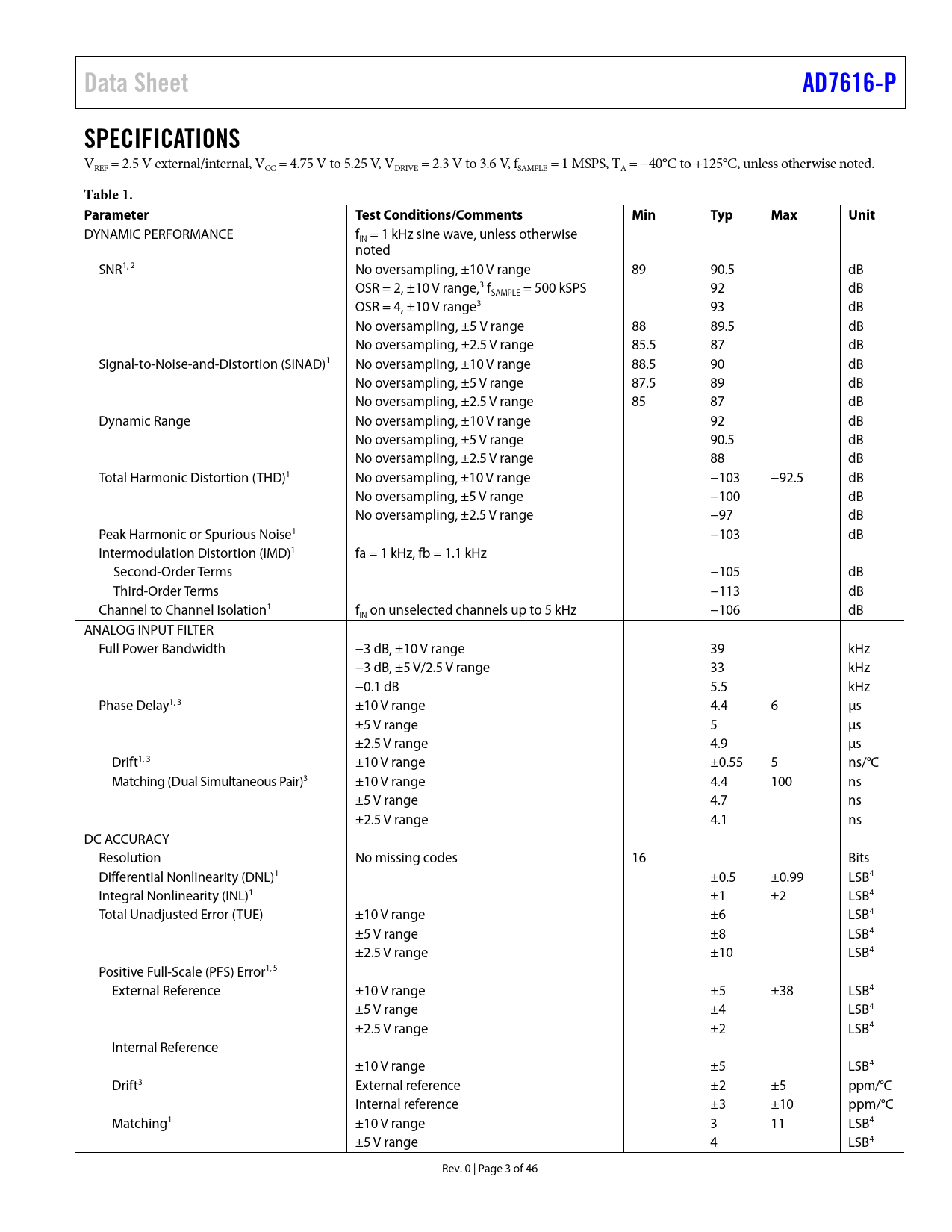 Data Sheet. AD7616-P. SPECIFICATIONS. Table 1. Parameter. Test Conditions/Comments. Min. Typ. Max. Unit