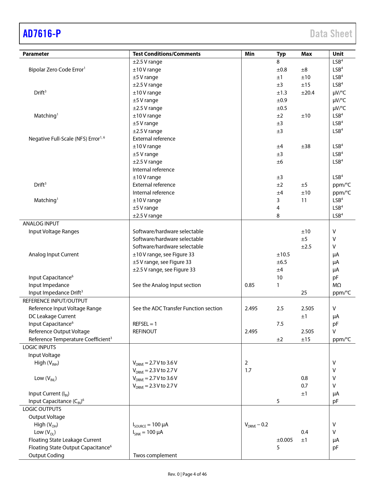 link to page 4 link to page 4 link to page 4 link to page 4 link to page 4 link to page 4 link to page 4 link to page 4 link to page 4 link to page 4 link to page 4 link to page 5 link to page 4 link to page 4 link to page 4 link to page 4 link to page 4 link to page 4 link to page 4 link to page 4 link to page 4 link to page 18 link to page 18 link to page 18 link to page 22 link to page 4 link to page 23 link to page 5 link to page 4 link to page 5 link to page 5 link to page 6 link to page 6 link to page 6 link to page 6 link to page 6 link to page 6 link to page 6 link to page 6 link to page 6 link to page 6 link to page 6 link to page 6 link to page 6 link to page 6 link to page 6 link to page 6 AD7616-PData SheetParameterTest Conditions/CommentsMinTypMaxUnit ±2.5 V range 8 LSB4 Bipolar Zero Code Error1 ±10 V range ±0.8 ±8 LSB4 ±5 V range ±1 ±10 LSB4 ±2.5 V range ±3 ±15 LSB4 Drift3 ±10 V range ±1.3 ±20.4 µV/°C ±5 V range ±0.9 µV/°C ±2.5 V range ±0.5 µV/°C Matching1 ±10 V range ±2 ±10 LSB4 ±5 V range ±3 LSB4 ±2.5 V range ±3 LSB4 Negative Full-Scale (NFS) Error1, 6 External reference ±10 V range ±4 ±38 LSB4 ±5 V range ±3 LSB4 ±2.5 V range ±6 LSB4 Internal reference ±10 V range ±3 LSB4 Drift3 External reference ±2 ±5 ppm/°C Internal reference ±4 ±10 ppm/°C Matching1 ±10 V range 3 11 LSB4 ±5 V range 4 LSB4 ±2.5 V range 8 LSB4 ANALOG INPUT Input Voltage Ranges Software/hardware selectable ±10 V Software/hardware selectable ±5 V Software/hardware selectable ±2.5 V Analog Input Current ±10 V range, see Figure 33 ±10.5 µA ±5 V range, see Figure 33 ±6.5 µA ±2.5 V range, see Figure 33 ±4 µA Input Capacitance6 10 pF Input Impedance See the Analog Input section 0.85 1 MΩ Input Impedance Drift3 25 ppm/°C REFERENCE INPUT/OUTPUT Reference Input Voltage Range See the ADC Transfer Function section 2.495 2.5 2.505 V DC Leakage Current ±1 µA Input Capacitance6 REFSEL = 1 7.5 pF Reference Output Voltage REFINOUT 2.495 2.505 V Reference Temperature Coefficient3 ±2 ±15 ppm/°C LOGIC INPUTS Input Voltage High (V ) V = 2.7 V to 3.6 V 2 V INH DRIVE V = 2.3 V to 2.7 V 1.7 V DRIVE Low (V ) V = 2.7 V to 3.6 V 0.8 V INL DRIVE V = 2.3 V to 2.7 V 0.7 V DRIVE Input Current (I ) ±1 µA IN Input Capacitance (C )6 5 pF IN LOGIC OUTPUTS Output Voltage High (V ) I = 100 µA V − 0.2 V OH SOURCE DRIVE Low (V ) I = 100 µA 0.4 V OL SINK Floating State Leakage Current ±0.005 ±1 µA Floating State Output Capacitance6 5 pF Output Coding Twos complement Rev. 0 | Page 4 of 46 Document Outline FEATURES APPLICATIONS GENERAL DESCRIPTION FUNCTIONAL BLOCK DIAGRAM TABLE OF CONTENTS REVISION HISTORY SPECIFICATIONS TIMING SPECIFICATIONS Universal Timing Specifications Parallel Interface Timing Specifications ABSOLUTE MAXIMUM RATINGS THERMAL RESISTANCE ESD CAUTION PIN CONFIGURATION AND FUNCTION DESCRIPTIONS TYPICAL PERFORMANCE CHARACTERISTICS TERMINOLOGY THEORY OF OPERATION CONVERTER DETAILS ANALOG INPUT Analog Input Channel Selection Analog Input Ranges Analog Input Impedance Analog Input Clamp Protection Analog Input Antialiasing Filter ADC TRANSFER FUNCTION INTERNAL/EXTERNAL REFERENCE SHUTDOWN MODE DIGITAL FILTER APPLICATIONS INFORMATION FUNCTIONALITY OVERVIEW POWER SUPPLIES TYPICAL CONNECTIONS DEVICE CONFIGURATION OPERATIONAL MODE INTERNAL/EXTERNAL REFERENCE HARDWARE MODE SOFTWARE MODE RESET FUNCTIONALITY PIN FUNCTION OVERVIEW DIGITAL INTERFACE CHANNEL SELECTION Hardware Mode Software Mode PARALLEL INTERFACE Reading Conversion Results Writing Register Data Reading Register Data SEQUENCER HARDWARE MODE SEQUENCER SOFTWARE MODE SEQUENCER BURST SEQUENCER Hardware Mode Burst Software Mode Burst DIAGNOSTICS DIAGNOSTIC CHANNELS INTERFACE SELF TEST CRC REGISTER SUMMARY ADDRESSING REGISTERS CONFIGURATION REGISTER CHANNEL REGISTER INPUT RANGE REGISTERS Input Range Register A1 Input Range Register A2 Input Range Register B1 Input Range Register B2 SEQUENCER STACK REGISTERS Sequencer Stack Register 0 to Sequencer Stack Register 7 Sequencer Stack Register 8 to Sequencer Stack Register 31 STATUS REGISTER OUTLINE DIMENSIONS ORDERING GUIDE