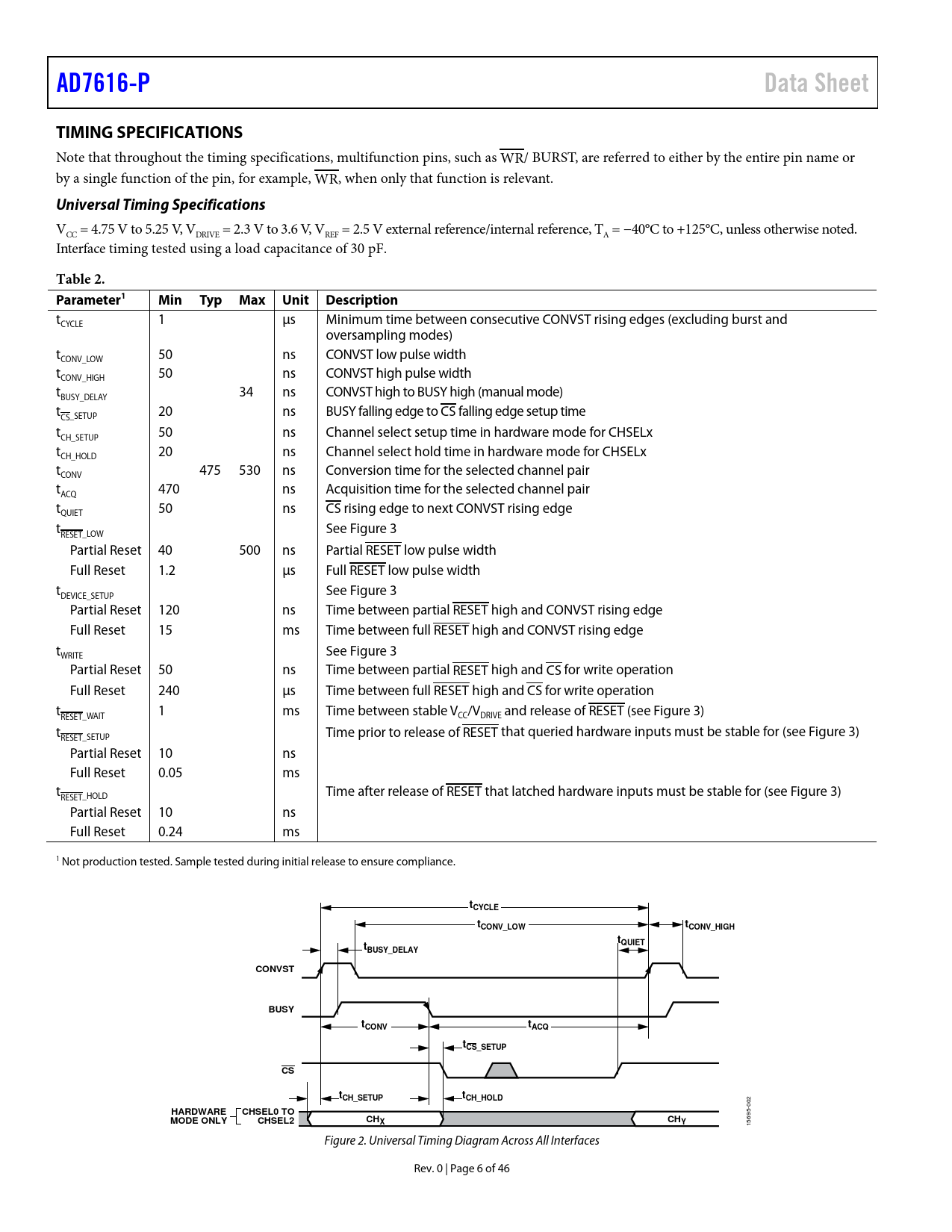 AD7616-P. Data Sheet. TIMING SPECIFICATIONS. Universal Timing Specifications. Table 2. Parameter1. Min Typ Max Unit Description