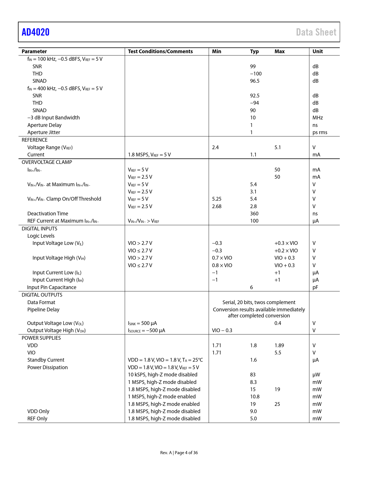 Pages / Page37 / 5 — AD4020. Data Sheet. Parameter. Test Conditions/Comments. Min. Typ. Max. …