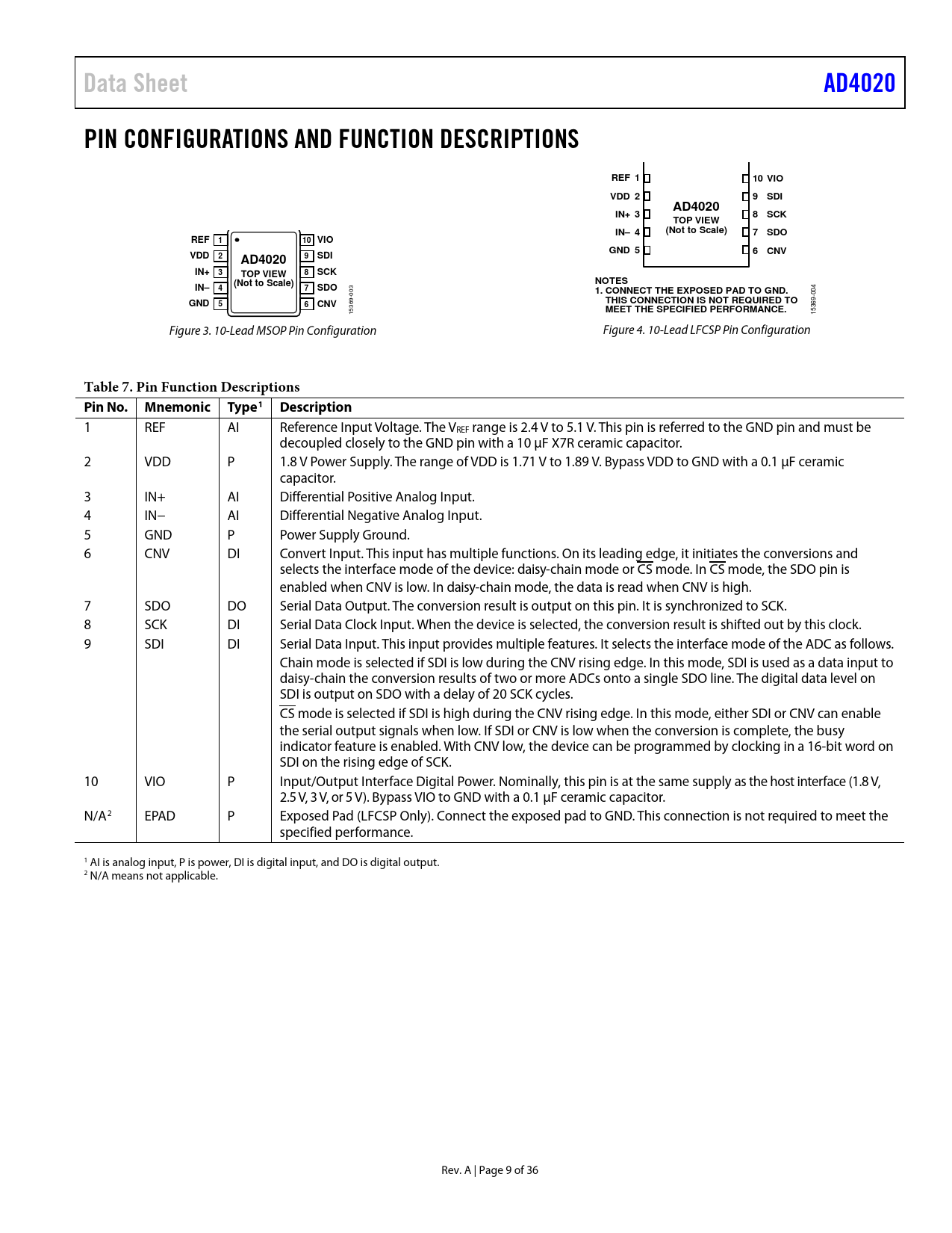 Data Sheet AD4020 PIN CONFIGURATIONS AND FUNCTION DESCRIPTIONS REF 1 10 VIO VDD 2 SDI IN+ 3 SCK TOP VIEW IN– 4 (Not to Scale) SDO