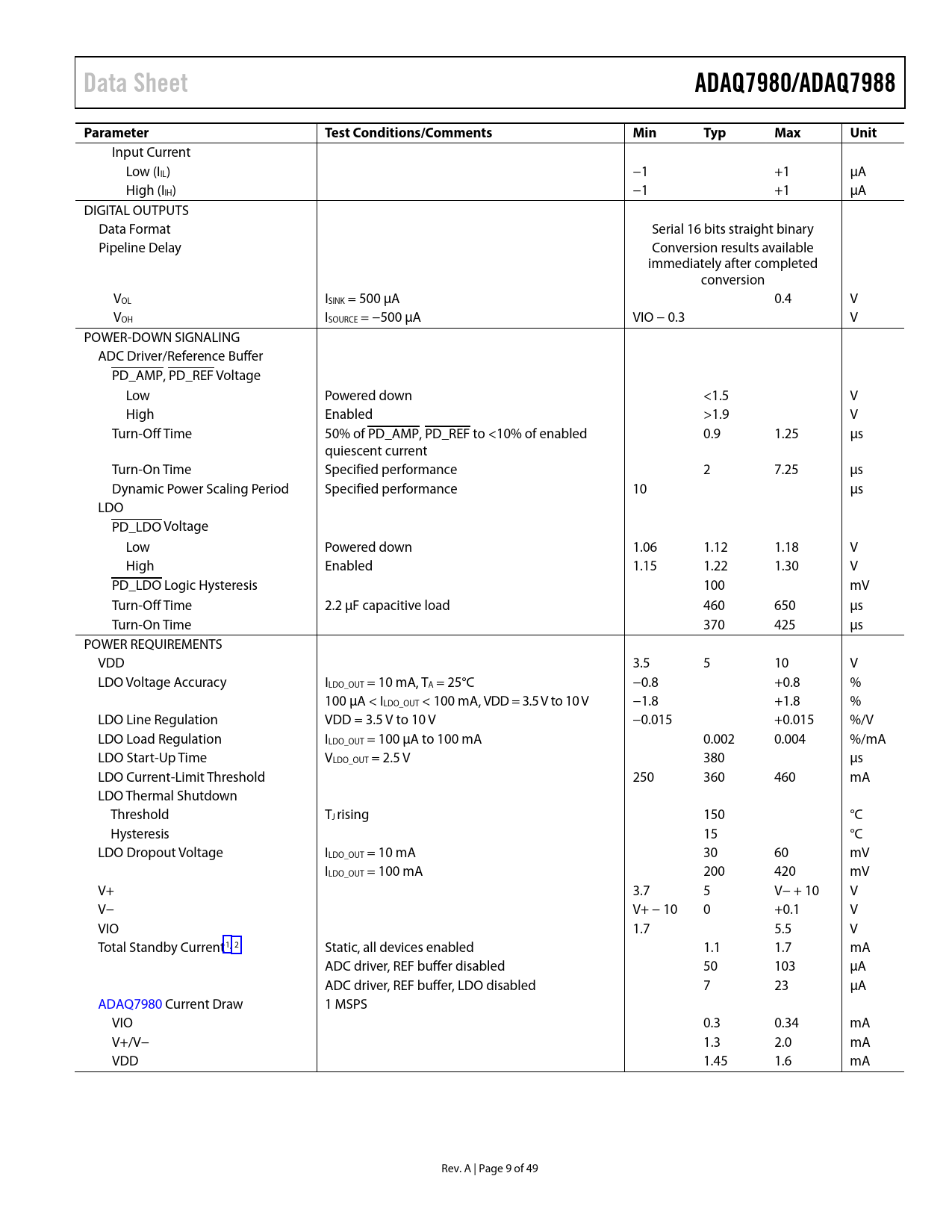 link to page 10 link to page 10 Data SheetADAQ7980/ADAQ7988ParameterTest Conditions/CommentsMinTypMaxUnit Input Current Low (IIL) −1 +1 µA High (IIH) −1 +1 µA DIGITAL OUTPUTS Data Format Serial 16 bits straight binary Pipeline Delay Conversion results available immediately after completed conversion VOL ISINK = 500 µA 0.4 V VOH ISOURCE = −500 µA VIO − 0.3 V POWER-DOWN SIGNALING ADC Driver/Reference Buffer PD_AMP, PD_REF Voltage Low Powered down <1.5 V High Enabled >1.9 V Turn-Off Time 50% of PD_AMP, PD_REF to <10% of enabled 0.9 1.25 µs quiescent current Turn-On Time Specified performance 2 7.25 µs Dynamic Power Scaling Period Specified performance 10 µs LDO PD_LDO Voltage Low Powered down 1.06 1.12 1.18 V High Enabled 1.15 1.22 1.30 V PD_LDO Logic Hysteresis 100 mV Turn-Off Time 2.2 µF capacitive load 460 650 µs Turn-On Time 370 425 µs POWER REQUIREMENTS VDD 3.5 5 10 V LDO Voltage Accuracy ILDO_OUT = 10 mA, TA = 25°C −0.8 +0.8 % 100 µA < ILDO_OUT < 100 mA, VDD = 3.5 V to 10 V −1.8 +1.8 % LDO Line Regulation VDD = 3.5 V to 10 V −0.015 +0.015 %/V LDO Load Regulation ILDO_OUT = 100 µA to 100 mA 0.002 0.004 %/mA LDO Start-Up Time VLDO_OUT = 2.5 V 380 µs LDO Current-Limit Threshold 250 360 460 mA LDO Thermal Shutdown Threshold TJ rising 150 °C Hysteresis 15 °C LDO Dropout Voltage ILDO_OUT = 10 mA 30 60 mV ILDO_OUT = 100 mA 200 420 mV V+ 3.7 5 V− + 10 V V− V+ − 10 0 +0.1 V VIO 1.7 5.5 V Total Standby Current1, 2 Static, all devices enabled 1.1 1.7 mA ADC driver, REF buffer disabled 50 103 µA ADC driver, REF buffer, LDO disabled 7 23 µA ADAQ7980 Current Draw 1 MSPS VIO 0.3 0.34 mA V+/V− 1.3 2.0 mA VDD 1.45 1.6 mA Rev. A | Page 9 of 49 Document Outline FEATURES APPLICATIONS GENERAL DESCRIPTION FUNCTIONAL BLOCK DIAGRAM TABLE OF CONTENTS REVISION HISTORY SPECIFICATIONS DUAL-SUPPLY CONFIGURATION SINGLE-SUPPLY CONFIGURATION TIMING SPECIFICATIONS ABSOLUTE MAXIMUM RATINGS THERMAL DATA THERMAL RESISTANCE ESD CAUTION PIN CONFIGURATION AND FUNCTION DESCRIPTIONS TYPICAL PERFORMANCE CHARACTERISTICS TERMINOLOGY THEORY OF OPERATION CIRCUIT INFORMATION CONVERTER OPERATION Transfer Functions TYPICAL CONNECTION DIAGRAM ADC DRIVER INPUT INPUT PROTECTION NOISE CONSIDERATIONS AND SIGNAL SETTLING OPERATION DYNAMIC POWER SCALING (DPS) SLEW ENHANCEMENT EFFECT OF FEEDBACK RESISTOR ON FREQUENCY RESPONSE VOLTAGE REFERENCE INPUT POWER SUPPLY LDO REGULATOR CURRENT-LIMIT AND THERMAL OVERLOAD PROTECTION LDO REGULATOR THERMAL CONSIDERATIONS DIGITAL INTERFACE 3-WIRE MODE WITHOUT THE BUSY INDICATOR 3-WIRE MODE WITH THE BUSY INDICATOR 4-WIRE MODE WITHOUT THE BUSY INDICATOR 4-WIRE MODE WITH THE BUSY INDICATOR CHAIN MODE WITHOUT THE BUSY INDICATOR CHAIN MODE WITH THE BUSY INDICATOR APPLICATION CIRCUITS NONUNITY GAIN CONFIGURATIONS INVERTING CONFIGURATION WITH LEVEL SHIFT USING THE ADAQ7980/ADAQ7988 WITH ACTIVE FILTERS APPLICATIONS INFORMATION LAYOUT EVALUATING THE PERFORMANCE OF THE ADAQ7980/ADAQ7988 OUTLINE DIMENSIONS ORDERING GUIDE
