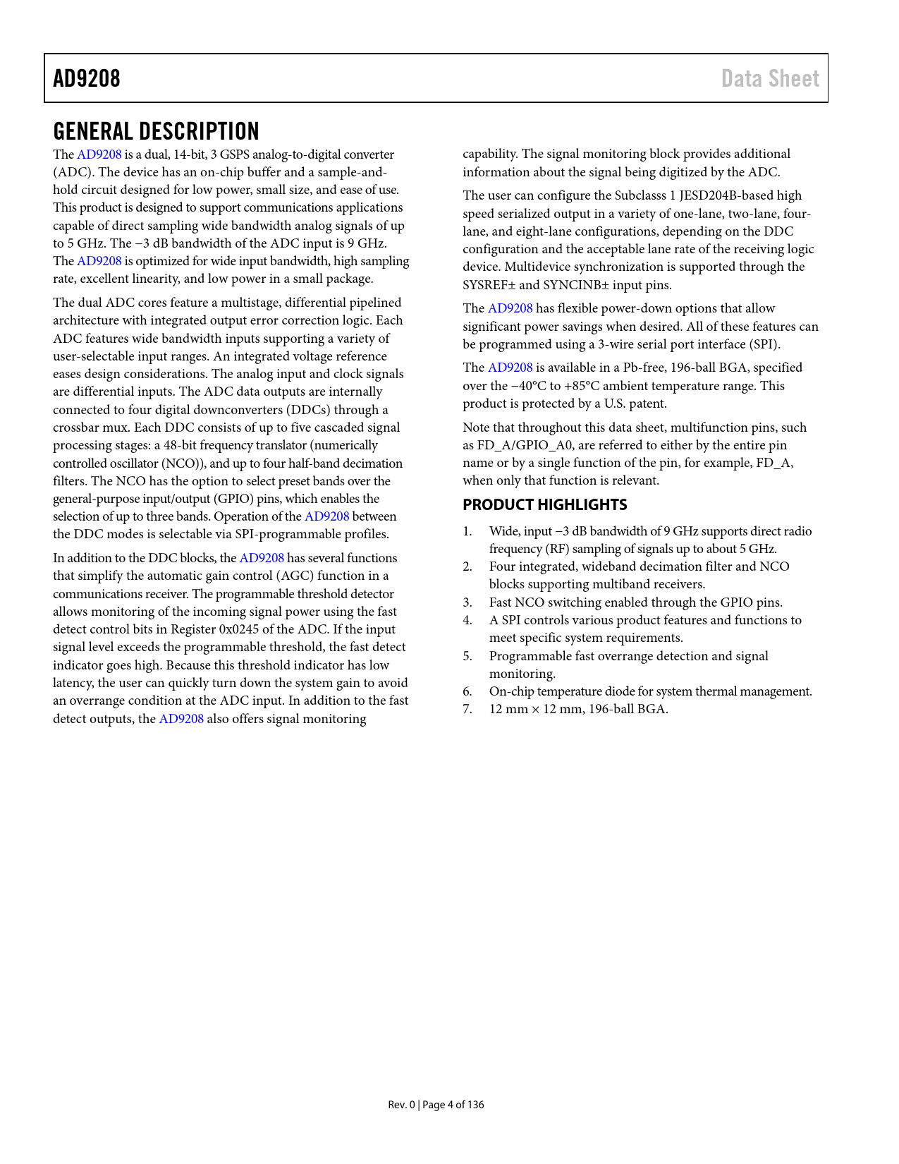 AD9208Data SheetGENERAL DESCRIPTION The AD9208 is a dual, 14-bit, 3 GSPS analog-to-digital converter capability. The signal monitoring block provides additional (ADC). The device has an on-chip buffer and a sample-and- information about the signal being digitized by the ADC. hold circuit designed for low power, small size, and ease of use. The user can configure the Subclasss 1 JESD204B-based high This product is designed to support communications applications speed serialized output in a variety of one-lane, two-lane, four- capable of direct sampling wide bandwidth analog signals of up lane, and eight-lane configurations, depending on the DDC to 5 GHz. The −3 dB bandwidth of the ADC input is 9 GHz. configuration and the acceptable lane rate of the receiving logic The AD9208 is optimized for wide input bandwidth, high sampling device. Multidevice synchronization is supported through the rate, excellent linearity, and low power in a small package. SYSREF± and SYNCINB± input pins. The dual ADC cores feature a multistage, differential pipelined The AD9208 has flexible power-down options that allow architecture with integrated output error correction logic. Each significant power savings when desired. All of these features can ADC features wide bandwidth inputs supporting a variety of be programmed using a 3-wire serial port interface (SPI). user-selectable input ranges. An integrated voltage reference eases design considerations. The analog input and clock signals The AD9208 is available in a Pb-free, 196-ball BGA, specified are differential inputs. The ADC data outputs are internally over the −40°C to +85°C ambient temperature range. This connected to four digital downconverters (DDCs) through a product is protected by a U.S. patent. crossbar mux. Each DDC consists of up to five cascaded signal Note that throughout this data sheet, multifunction pins, such processing stages: a 48-bit frequency translator (numerically as FD_A/GPIO_A0, are referred to either by the entire pin controlled oscillator (NCO)), and up to four half-band decimation name or by a single function of the pin, for example, FD_A, filters. The NCO has the option to select preset bands over the when only that function is relevant. general-purpose input/output (GPIO) pins, which enables the PRODUCT HIGHLIGHTS selection of up to three bands. Operation of the AD9208 between the DDC modes is selectable via SPI-programmable profiles. 1. Wide, input −3 dB bandwidth of 9 GHz supports direct radio frequency (RF) sampling of signals up to about 5 GHz. In addition to the DDC blocks, the AD9208 has several functions 2. Four integrated, wideband decimation filter and NCO that simplify the automatic gain control (AGC) function in a blocks supporting multiband receivers. communications receiver. The programmable threshold detector 3. Fast NCO switching enabled through the GPIO pins. allows monitoring of the incoming signal power using the fast 4. A SPI controls various product features and functions to detect control bits in Register 0x0245 of the ADC. If the input meet specific system requirements. signal level exceeds the programmable threshold, the fast detect 5. Programmable fast overrange detection and signal indicator goes high. Because this threshold indicator has low monitoring. latency, the user can quickly turn down the system gain to avoid 6. On-chip temperature diode for system thermal management. an overrange condition at the ADC input. In addition to the fast 7. 12 mm × 12 mm, 196-ball BGA. detect outputs, the AD9208 also offers signal monitoring Rev. 0 | Page 4 of 136 Document Outline FEATURES APPLICATIONS FUNCTIONAL BLOCK DIAGRAM TABLE OF CONTENTS REVISION HISTORY GENERAL DESCRIPTION SPECIFICATIONS DC SPECIFICATIONS AC SPECIFICATIONS DIGITAL SPECIFICATIONS SWITCHING SPECIFICATIONS TIMING SPECIFICATIONS Timing Diagrams ABSOLUTE MAXIMUM RATINGS THERMAL RESISTANCE ESD CAUTION PIN CONFIGURATION AND FUNCTION DESCRIPTIONS TYPICAL PERFORMANCE CHARACTERISTICS EQUIVALENT CIRCUITS THEORY OF OPERATION ADC ARCHITECTURE ANALOG INPUT CONSIDERATIONS Differential Input Configurations Input Common Mode Analog Input Buffer Controls and SFDR Optimization Dither Absolute Maximum Input Swing VOLTAGE REFERENCE DC OFFSET CALIBRATION CLOCK INPUT CONSIDERATIONS Clock Duty Cycle Considerations Input Clock Divider Input Clock Divider ½ Period Delay Adjust Clock Fine Delay and Superfine Delay Adjust Clock Coupling Considerations Clock Jitter Considerations POWER-DOWN/STANDBY MODE TEMPERATURE DIODE ADC OVERRANGE AND FAST DETECT ADC OVERRANGE FAST THRESHOLD DETECTION (FD_A AND FD_B) ADC APPLICATION MODES AND JESD204B Tx CONVERTER MAPPING PROGRAMMABLE FIR FILTERS SUPPORTED MODES PROGRAMMING INSTRUCTIONS DIGITAL DOWNCONVERTER (DDC) DDC I/Q INPUT SELECTION DDC I/Q OUTPUT SELECTION DDC GENERAL DESCRIPTION DDC Frequency Translation Stage (Optional) DDC Filtering Stage DDC Gain Stage (Optional) DDC Complex to Real Conversion Stage (Optional) DDC FREQUENCY TRANSLATION DDC Frequency Translation General Description Variable IF Mode 0 Hz IF (ZIF) Mode fS/4 Hz IF Mode Test Mode DDC NCO Description DDC NCO Programmable Modulus Mode DDC NCO Coherent Mode NCO FTW/POW/MAW/MAB Description NCO FTW/POW/MAW/MAB Programmable Modulus Mode NCO FTW/POW/MAW/MAB Coherent Mode NCO Channel Selection Setting Up the Multichannel NCO Feature NCO Synchronization NCO Multichip Synchronization For these reasons, the AD9208 contains a synchronization triggering mechanism that allows the following: NCO Multichip Synchronization at Startup NCO Multichip Synchronization During Normal Operation DDC Mixer Description DDC NCO + Mixer Loss and SFDR DDC DECIMATION FILTERS HB4 Filter Description HB3 Filter Description HB2 Filter Description HB1 Filter Description TB2 Filter Description TB1 Filter Description FB2 Filter Description DDC GAIN STAGE DDC COMPLEX TO REAL CONVERSION DDC MIXED DECIMATION SETTINGS DDC EXAMPLE CONFIGURATIONS DDC POWER CONSUMPTION SIGNAL MONITOR SPORT OVER JE