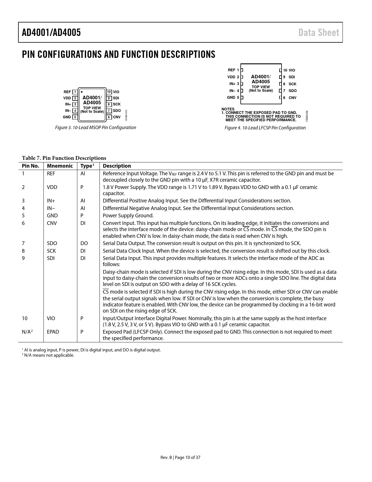 Pages / Page37 / 10 — AD4001/AD4005. Data Sheet. PIN CONFIGURATIONS AND FUNCTION DESCRIPTIONS. …