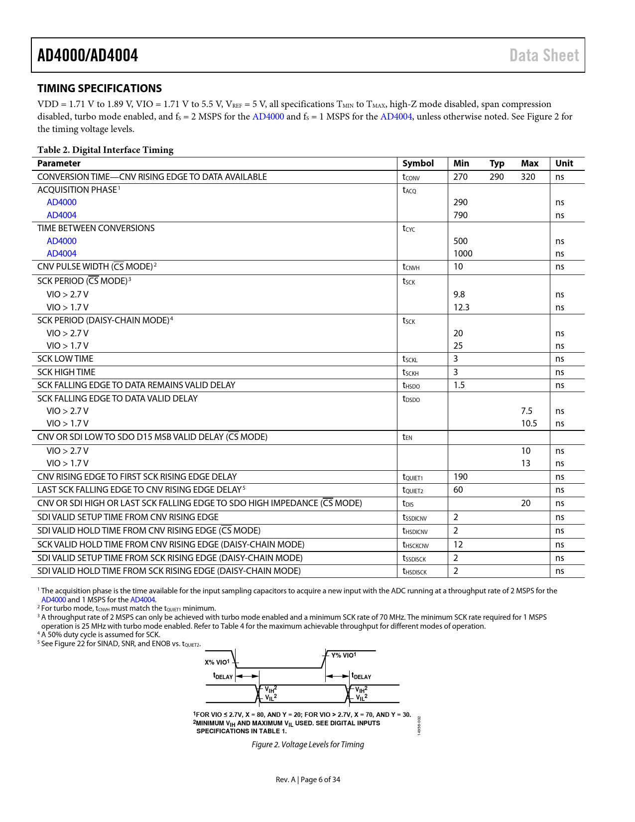 Pages / Page34 / 6 — AD4000/AD4004. Data Sheet. TIMING SPECIFICATIONS. Table 2. Digital …