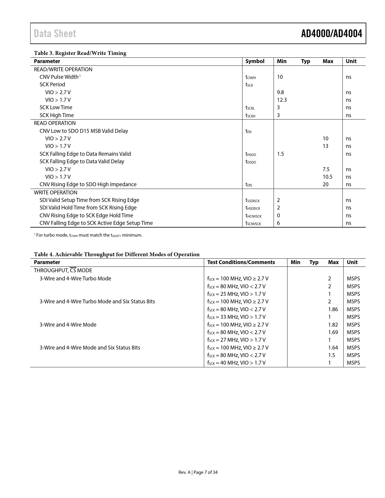 | Pages / Page | 34 / 7 — Data Sheet. AD4000/AD4004. Table 3. Register Read/Write Timing Parameter. … |