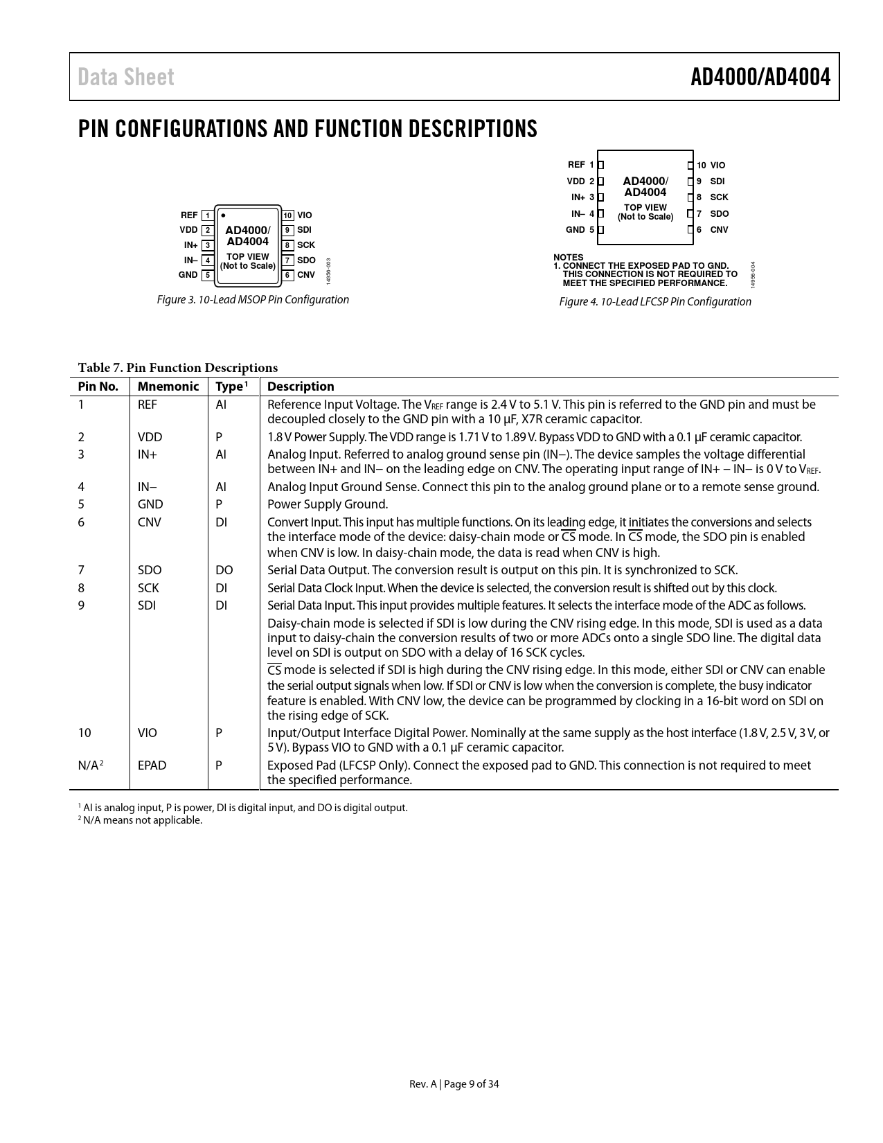 link to page 12 Data SheetAD4000/AD4004PIN CONFIGURATIONS AND FUNCTION DESCRIPTIONSREF 110 VIOVDD 2AD4000/9SDIAD4004IN+ 38SCKTOP VIEWREF110 VIOIN– 47SDO(Not to Scale)VDD2AD4000/9SDIGND 56CNVIN+AD400438SCKIN–4TOP VIEW7SDONOTES 003 (Not to Scale)1. CONNECT THE EXPOSED PAD TO GND. 004 GND56CNVTHIS CONNECTION IS NOT REQUIRED TO 14956- MEET THE SPECIFIED PERFORMANCE. 14956- Figure 3. 10-Lead MSOP Pin Configuration Figure 4. 10-Lead LFCSP Pin Configuration Table 7. Pin Function Descriptions Pin No.Mnemonic Type1Description 1 REF AI Reference Input Voltage. The VREF range is 2.4 V to 5.1 V. This pin is referred to the GND pin and must be decoupled closely to the GND pin with a 10 µF, X7R ceramic capacitor. 2 VDD P 1.8 V Power Supply. The VDD range is 1.71 V to 1.89 V. Bypass VDD to GND with a 0.1 μF ceramic capacitor. 3 IN+ AI Analog Input. Referred to analog ground sense pin (IN−). The device samples the voltage differential between IN+ and IN− on the leading edge on CNV. The operating input range of IN+ − IN− is 0 V to VREF. 4 IN− AI Analog Input Ground Sense. Connect this pin to the analog ground plane or to a remote sense ground. 5 GND P Power Supply Ground. 6 CNV DI Convert Input. This input has multiple functions. On its leading edge, it initiates the conversions and selects the interface mode of the device: daisy-chain mode or CS mode. In CS mode, the SDO pin is enabled when CNV is low. In daisy-chain mode, the data is read when CNV is high. 7 SDO DO Serial Data Output. The conversion result is output on this pin. It is synchronized to SCK. 8 SCK DI Serial Data Clock Input. When the device is selected, the conversion result is shifted out by this clock. 9 SDI DI Serial Data Input. This input provides multiple features. It selects the interface mode of the ADC as follows. Daisy-chain mode is selected if SDI is low during the CNV rising edge. In this mode, SDI is used as a data input to daisy-chain the conversion results of two or more ADCs onto a single SDO line. The digital data level on SDI is output on SDO with a delay of 16 SCK cycles. CS mode is selected if SDI is high during the CNV rising edge. In this mode, either SDI or CNV can enable the serial output signals when low. If SDI or CNV is low when the conversion is complete, the busy indicator feature is enabled. With CNV low, the device can be programmed by clocking in a 16-bit word on SDI on the rising edge of SCK. 10 VIO P Input/Output Interface Digital Power. Nominally at the same supply as the host interface (1.8 V, 2.5 V, 3 V, or 5 V). Bypass VIO to GND with a 0.1 μF ceramic capacitor. N/A2 EPAD P Exposed Pad (LFCSP Only). Connect the exposed pad to GND. This connection is not required to meet the specified performance. 1 AI is analog input, P is power, DI is digital input, and DO is digital output. 2 N/A means not applicable. Rev. A | Page 9 of 34 Document Outline FEATURES APPLICATIONS GENERAL DESCRIPTION FUNCTIONAL BLOCK DIAGRAM TABLE OF CONTENTS REVISION HISTORY SPECIFICATIONS TIMING SPECIFICATIONS ABSOLUTE MAXIMUM RATINGS THERMAL RESISTANCE ESD CAUTION PIN CONFIGURATIONS AND FUNCTION DESCRIPTIONS TYPICAL PERFORMANCE CHARACTERISTICS TERMINOLOGY THEORY OF OPERATION CIRCUIT INFORMATION CONVERTER OPERATION TRANSFER FUNCTIONS APPLICATIONS INFORMATION TYPICAL APPLICATION DIAGRAMS ANALOG INPUTS Input Overvoltage Clamp Circuit Switched Capacitor Input RC Filter Values DRIVER AMPLIFIER CHOICE High Frequency Input Signals EASE OF DRIVE FEATURES Input Span Compression High-Z Mode Long Acquisition Phase VOLTAGE REFERENCE INPUT POWER SUPPLY DIGITAL INTERFACE REGISTER READ/WRITE FUNCTIONALITY STATUS WORD CSB MODE, 3-WIRE TURBO MODE CSB MODE, 3-WIRE WITHOUT BUSY INDICATOR CSB MODE, 3-WIRE WITH BUSY INDICATOR CSB MODE, 4-WIRE TURBO MODE CSB MODE, 4-WIRE WITHOUT BUSY INDICATOR CSB MODE, 4-WIRE WITH BUSY INDICATOR DAISY-CHAIN MODE LAYOUT GUIDELINES EVALUATING THE AD4000/AD4004 PERFORMANCE OUTLINE DIMENSIONS ORDERING GUIDE