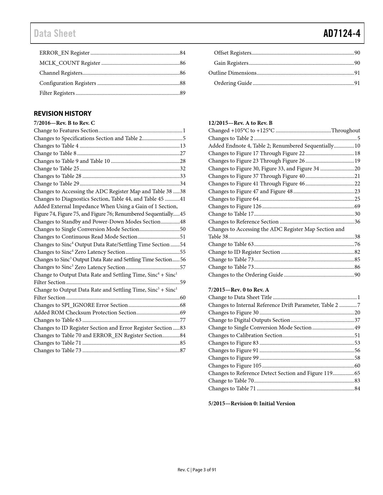 link to page 85 link to page 87 link to page 87 link to page 89 link to page 90 link to page 91 link to page 91 link to page 92 link to page 92 Data SheetAD7124-4 ERROR_EN Register .. 84 Offset Registers .. 90 MCLK_COUNT Register .. 86 Gain Registers .. 90 Channel Registers .. 86 Outline Dimensions .. 91 Configuration Registers ... 88 Ordering Guide ... 91 Filter Registers ... 89 REVISION HISTORY7/2016—Rev. B to Rev. C12/2015—Rev. A to Rev. B Change to Features Section .. 1 Changed +105°C to +125°C ... Throughout Changes to Specifications Section and Table 2.. 5 Changes to Table 2 .. 5 Changes to Table 4 .. 13 Added Endnote 4, Table 2; Renumbered Sequentially ... 10 Change to Table 8 .. 27 Changes to Figure 17 Through Figure 22 .. 18 Changes to Table 9 and Table 10 ... 28 Changes to Figure 23 Through Figure 26 .. 19 Change to Table 25 .. 32 Changes to Figure 30, Figure 33, and Figure 34 ... 20 Changes to Table 28 .. 33 Changes to Figure 37 Through Figure 40 .. 21 Change to Table 29 .. 34 Changes to Figure 41 Through Figure 46 .. 22 Changes to Accessing the ADC Register Map and Table 38 ... 38 Changes to Figure 47 and Figure 48 ... 23 Changes to Diagnostics Section, Table 44, and Table 45 ... 41 Changes to Figure 64 .. 25 Added External Impedance When Using a Gain of 1 Section, Changes to Figure 126 .. 69 Figure 74, Figure 75, and Figure 76; Renumbered Sequentially ... 45 Change to Table 17 .. 30 Changes to Standby and Power-Down Modes Section .. 48 Changes to Reference Section ... 36 Changes to Single Conversion Mode Section .. 50 Changes to Accessing the ADC Register Map Section and Changes to Continuous Read Mode Section ... 51 Table 38 ... 38 Changes to Sinc4 Output Data Rate/Settling Time Section ... 54 Change to Table 63 .. 76 Changes to Sinc4 Zero Latency Section .. 55 Change to ID Register Section .. 82 Changes to Sinc3 Output Data Rate and Settling Time Section .. 56 Change to Table 73 .. 85 Changes to Sinc3 Zero Latency Section .. 57 Change to Table 73 .. 86 Change to Output Data Rate and Settling Time, Sinc4 + Sinc1 Changes to the Ordering Guide .. 90 Filter Section .. 59 Change to Output Data Rate and Settling Time, Sinc3 + Sinc1 7/2015—Rev. 0 to Rev. A Filter Section .. 60 Change to Data Sheet Title .. 1 Changes to SPI_IGNORE Error Section .. 68 Changes to Internal Reference Drift Parameter, Table 2 ... 7 Added ROM Checksum Protection Section .. 69 Changes to Figure 30 .. 20 Changes to Table 63 .. 77 Change to Digital Outputs Section ... 37 Changes to ID Register Section and Error Register Section ... 83 Change to Single Conversion Mode Section ... 49 Changes to Table 70 and ERROR_EN Register Section... 84 Changes to Calibration Section ... 51 Changes to Table 71 .. 85 Changes to Figure 83 .. 53 Changes to Table 73 .. 87 Changes to Figure 91 .. 56 Changes to Figure 99 .. 58 Changes to Figure 105 .. 60 Changes to Reference Detect Section and Figure 119 .. 65 Change to Table 70 .. 83 Changes to Table 71 .. 84 5/2015—Revision 0: Initial Version Rev. C | Page 3 of 91 Document Outline FEATURES APPLICATIONS FUNCTIONAL BLOCK DIAGRAM TABLE OF CONTENTS REVISION HISTORY GENERAL DESCRIPTION SPECIFICATIONS TIMING CHARACTERISTICS Timing Diagrams ABSOLUTE MAXIMUM RATINGS THERMAL RESISTANCE ESD CAUTION PIN CONFIGURATION AND FUNCTION DESCRIPTIONS TYPICAL PERFORMANCE CHARACTERISTICS TERMINOLOGY RMS NOISE AND RESOLUTION FULL POWER MODE Sinc4 Sinc3 Post Filters Fast Settling Filter (Sinc4 + Sinc1) Fast Settling Filter (Sinc3 + Sinc1) MID POWER MODE Sinc4 Sinc3 Post Filters Fast Settling Filter (Sinc4 + Sinc1) Fast Settling Filter (Sinc3 + Sinc1) LOW POWER MODE Sinc4 Sinc3 Post Filters Fast Settling Filter (Sinc4 + Sinc1) Fast Settling Filter (Sinc3 + Sinc1) GETTING STARTED OVERVIEW Power Modes Analog Inputs Multiplexer Reference Programmable Gain Array (PGA) Burnout Currents Σ-Δ ADC and Filter Channel Sequencer Per Channel Configuration Serial Interface Clock Temperature Sensor Digital Outputs Calibration Excitation Currents Bias Voltage Bridge Power Switch (PSW) Diagnostics POWER SUPPLIES Single Supply Operation (AVSS = DGND) Split Supply Operation (AVSS ≠ DGND) DIGITAL COMMUNICATION Accessing the ADC Register Map CONFIGURATION OVERVIEW Channel Configuration Channel Registers ADC Setups Configuration Registers Filter Registers Offset Registers Gain Registers Diagnostics ADC Control Register Understanding Configuration Flexibility ADC CIRCUIT INFORMATION ANALOG INPUT CHANNEL EXTERNAL IMPEDANCE WHEN USING A GAIN OF 1 PROGRAMMABLE GAIN ARRAY (PGA) REFERENCE BIPOLAR/UNIPOLAR CONFIGURATION DATA OUTPUT CODING EXCITATION CURRENTS BRIDGE POWER-DOWN SWITCH LOGIC OUTPUTS BIAS VOLTAGE GENERATOR CLOCK POWER MODES STANDBY AND POWER-DOWN MODES DIGITAL INTERFACE Single Conversion Mode Continuous Conversion Mode Continuous Read Mode DATA_STATUS SERIAL INTERFACE RESET (DOUT__DEL AND _EN BITS) RESET CALIBRATION SPAN AND OFFSET LIMITS SYSTEM SYNCHRONIZATION DIGITAL FILTER SINC4 FILTER Sinc4 Output Data Rate/Settling Time Sinc4 Zero Latency Sequencer Sinc4 50 Hz and 60 Hz Rejection SINC3 FILTER Sinc3 Output Data Rate and Settling Time Sinc3 Zero Latency Sequencer Sinc3 50 Hz and 60 Hz Rejection FAST SETTLING MODE (SINC4 + SINC1 FILTER) Output Data Rate and Settling Time, Sinc4 + Sinc1 Filter Sequencer 50 Hz and 60 Hz Rejection, Sinc4 + Sinc1 Filter FAST SETTLING MODE (SINC3 + SINC1 FILTER) Output Data Rate and Settling Time, Sinc3 + Sinc1 Filter Sequencer 50 Hz and 60 Hz Rejection, Sinc3 + Sinc1 Filter POST FILTERS SUMMARY OF FILTER OPTIONS DIAGNOSTICS SIGNAL CHAIN CHECK REFERENCE DETECT CALIBRATION, CONVERSION, AND SATURATION ERRORS OVERVOLTAGE/UNDERVOLTAGE DETECTION POWER SUPPLY MONITORS LDO MONITORING Power Supply Monitor LDO Capacitor Detect MCLK COUNTER SPI SCLK COUNTER SPI READ/WRITE ERRORS SPI_IGNORE ERROR CHECKSUM PROTECTION MEMORY MAP CHECKSUM PROTECTION ROM CHECKSUM PROTECTION CRC Calculation Example of a Polynomial CRC Calculation—24-Bit Word: 0x654321 (8-Bit Command and 16-Bit Data) BU