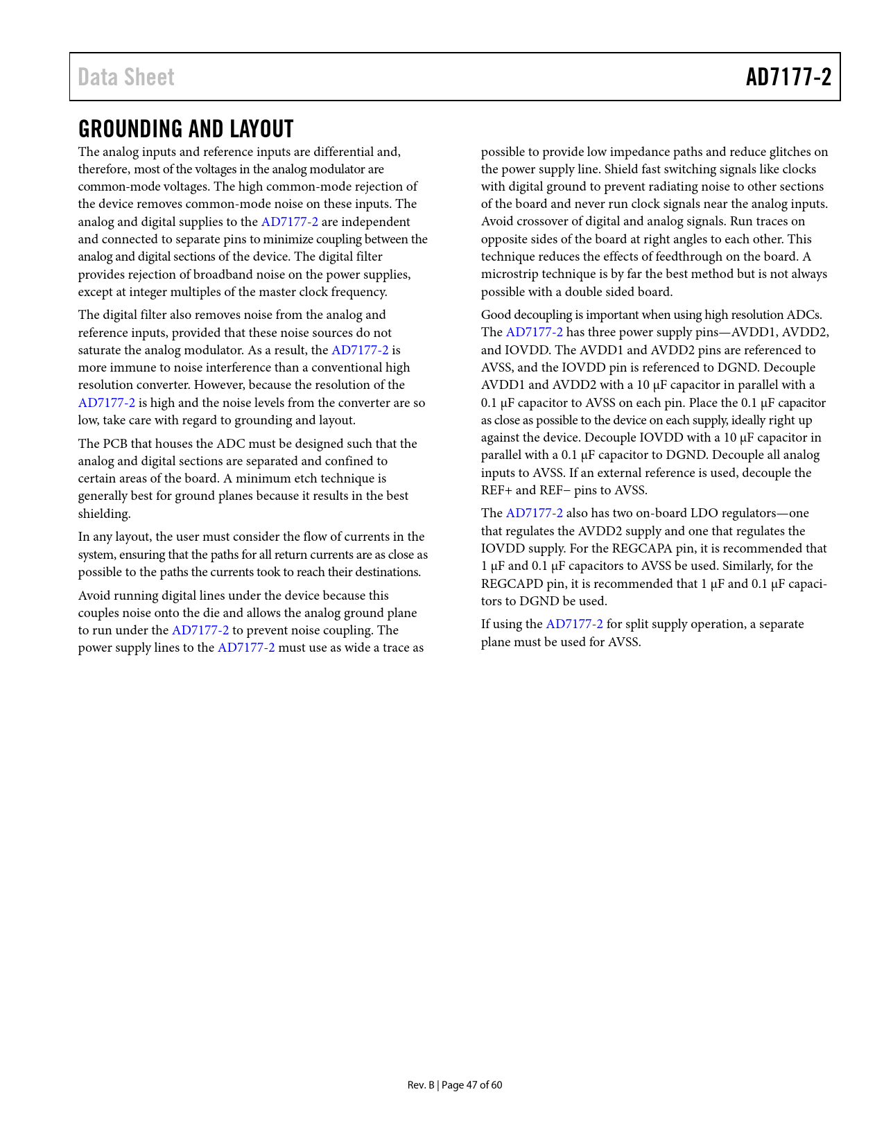 Data SheetAD7177-2GROUNDING AND LAYOUT The analog inputs and reference inputs are differential and, possible to provide low impedance paths and reduce glitches on therefore, most of the voltages in the analog modulator are the power supply line. Shield fast switching signals like clocks common-mode voltages. The high common-mode rejection of with digital ground to prevent radiating noise to other sections the device removes common-mode noise on these inputs. The of the board and never run clock signals near the analog inputs. analog and digital supplies to the AD7177-2 are independent Avoid crossover of digital and analog signals. Run traces on and connected to separate pins to minimize coupling between the opposite sides of the board at right angles to each other. This analog and digital sections of the device. The digital filter technique reduces the effects of feedthrough on the board. A provides rejection of broadband noise on the power supplies, microstrip technique is by far the best method but is not always except at integer multiples of the master clock frequency. possible with a double sided board. The digital filter also removes noise from the analog and Good decoupling is important when using high resolution ADCs. reference inputs, provided that these noise sources do not The AD7177-2 has three power supply pins—AVDD1, AVDD2, saturate the analog modulator. As a result, the AD7177-2 is and IOVDD. The AVDD1 and AVDD2 pins are referenced to more immune to noise interference than a conventional high AVSS, and the IOVDD pin is referenced to DGND. Decouple resolution converter. However, because the resolution of the AVDD1 and AVDD2 with a 10 µF capacitor in paral el with a AD7177-2 is high and the noise levels from the converter are so 0.1 µF capacitor to AVSS on each pin. Place the 0.1 µF capacitor low, take care with regard to grounding and layout. as close as possible to the device on each supply, ideal y right up The PCB that houses the ADC must be designed such that the against the device. Decouple IOVDD with a 10 µF capacitor in analog and digital sections are separated and confined to parallel with a 0.1 µF capacitor to DGND. Decouple all analog certain areas of the board. A minimum etch technique is inputs to AVSS. If an external reference is used, decouple the general y best for ground planes because it results in the best REF+ and REF− pins to AVSS. shielding. The AD7177-2 also has two on-board LDO regulators—one In any layout, the user must consider the flow of currents in the that regulates the AVDD2 supply and one that regulates the system, ensuring that the paths for al return currents are as close as IOVDD supply. For the REGCAPA pin, it is recommended that possible to the paths the currents took to reach their destinations. 1 µF and 0.1 µF capacitors to AVSS be used. Similarly, for the REGCAPD pin, it is recommended that 1 µF and 0.1 µF capaci- Avoid running digital lines under the device because this tors to DGND be used. couples noise onto the die and al ows the analog ground plane to run under the AD7177-2 to prevent noise coupling. The If using the AD7177-2 for split supply operation, a separate power supply lines to the AD7177-2 must use as wide a trace as plane must be used for AVSS. Rev. B | Page 47 of 60 Document Outline FEATURES APPLICATIONS GENERAL DESCRIPTION FUNCTIONAL BLOCK DIAGRAM TABLE OF CONTENTS REVISION HISTORY SPECIFICATIONS TIMING CHARACTERISTICS Timing Diagrams ABSOLUTE MAXIMUM RATINGS THERMAL RESISTANCE ESD CAUTION PIN CONFIGURATION AND FUNCTION DESCRIPTIONS TYPICAL PERFORMANCE CHARACTERISTICS NOISE PERFORMANCE AND RESOLUTION GETTING STARTED POWER SUPPLIES DIGITAL COMMUNICATION Accessing the ADC Register Map AD7177-2 RESET CONFIGURATION OVERVIEW Channel Configuration Channel Registers ADC Setups Setup Configuration Registers Filter Configuration Registers Gain Registers Offset Registers ADC Mode and Interface Mode Configuration ADC Mode Register Interface Mode Register Understanding Configuration Flexibility CIRCUIT DESCRIPTION BUFFERED ANALOG INPUT CROSSPOINT MULTIPLEXER Fully Differential Inputs Single-Ended Inputs AD7177-2 REFERENCE External Reference Internal Reference BUFFERED REFERENCE INPUT CLOCK SOURCE Internal Oscillator External Crystal External Clock DIGITAL FILTERS SINC5 + SINC1 FILTER SINC3 FILTER SINGLE CYCLE SETTLING ENHANCED 50 HZ AND 60 HZ REJECTION FILTERS OPERATING MODES CONTINUOUS CONVERSION MODE CONTINUOUS READ MODE SINGLE CONVERSION MODE STANDBY AND POWER-DOWN MODES CALIBRATION DIGITAL INTERFACE CHECKSUM PROTECTION CRC CALCULATION Polynomial Example of a Polynomial CRC Calculation—24-Bit Word: 0x654321 (Eight Command Bits and 16-Bit Data) XOR Calculation Example of an XOR Calculation—24-Bit Word: 0x654321 (Eight Command Bits and 16-Bit Data) INTEGRATED FUNCTIONS GENERAL-PURPOSE I/O EXTERNAL MULTIPLEXER CONTROL DELAY 24-BIT/32-BIT CONVERSIONS DOUT_RESET SYNCHRONIZATION Normal Synchronization Alternate Synchronization ERROR FLAGS ADC_ERROR CRC_ERROR REG_ERROR Input/Output DATA_STAT IOSTRENGTH INTERNAL TEMPERATURE SENSOR GROUNDING AND LAYOUT REGISTER SUMMARY REGISTER DETAILS COMMUNICATIONS REGISTER STATUS REGISTER ADC MODE REGISTER INTERFACE MODE REGISTER REGISTER CHECK DATA REGISTER GPIO CONFIGURATION REGISTER ID REGISTER CHANNEL REGISTER 0 CHANNEL REGISTER 1 TO CHANNEL REGISTER 3 SETUP CONFIGURATION REGISTER 0 SETUP CONFIGURATION REGISTER 1 TO SETUP CONFIGURATION REGISTER 3 FILTER CONFIGURATION REGISTER 0 FILTER CONFIGURATION REGISTER 1 TO FILTER CONFIGURATION REGISTER 3 OFFSET REGISTER 0 OFFSET REGISTER 1 TO OFFSET REGISTER 3 GAIN REGISTER 0 GAIN REGISTER 1 TO GAIN REGISTER 3 OUTLINE DIMENSIONS ORDERING GUIDE