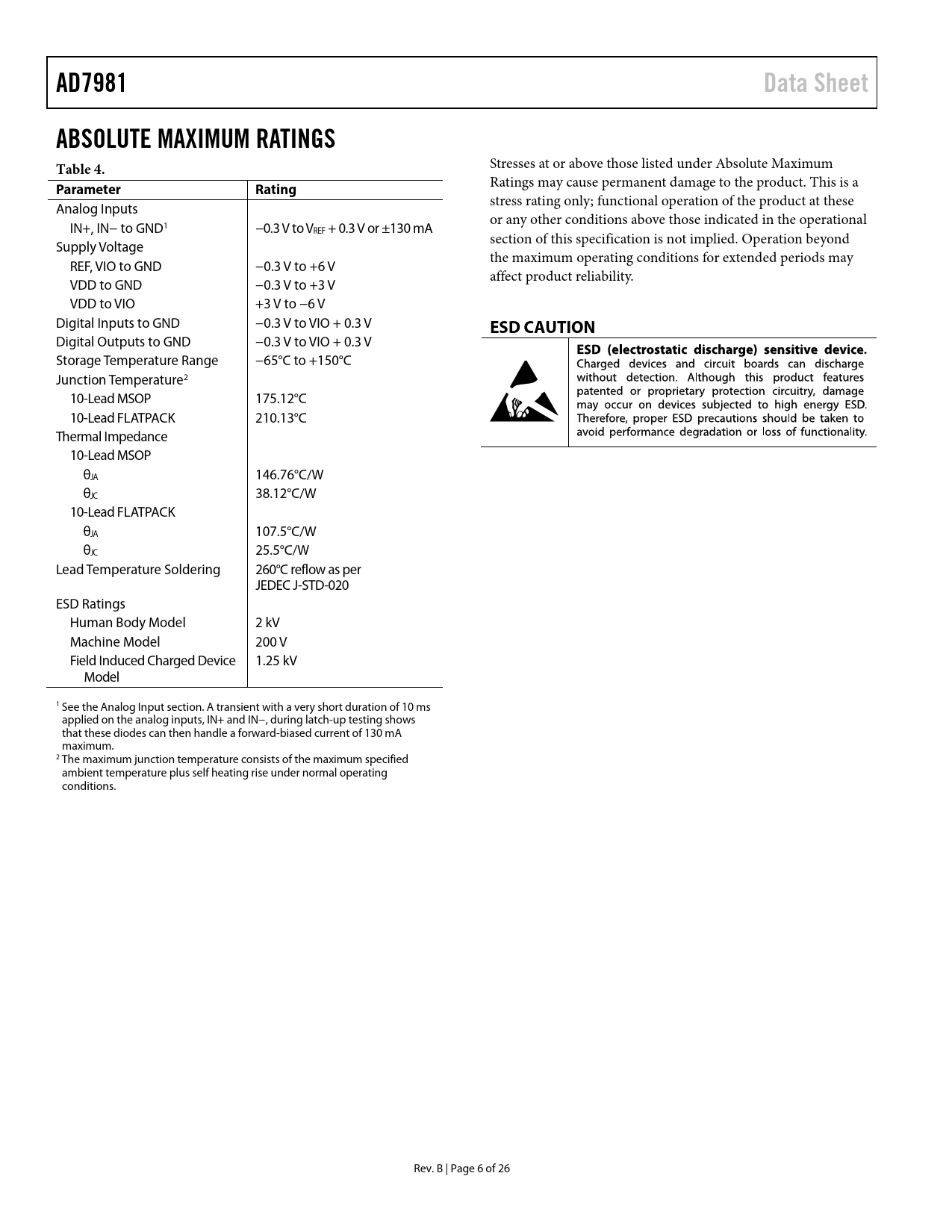 Pages / Page26 / 6 — AD7981. Data Sheet. ABSOLUTE MAXIMUM RATINGS Table 4. Parameter. Rating. …