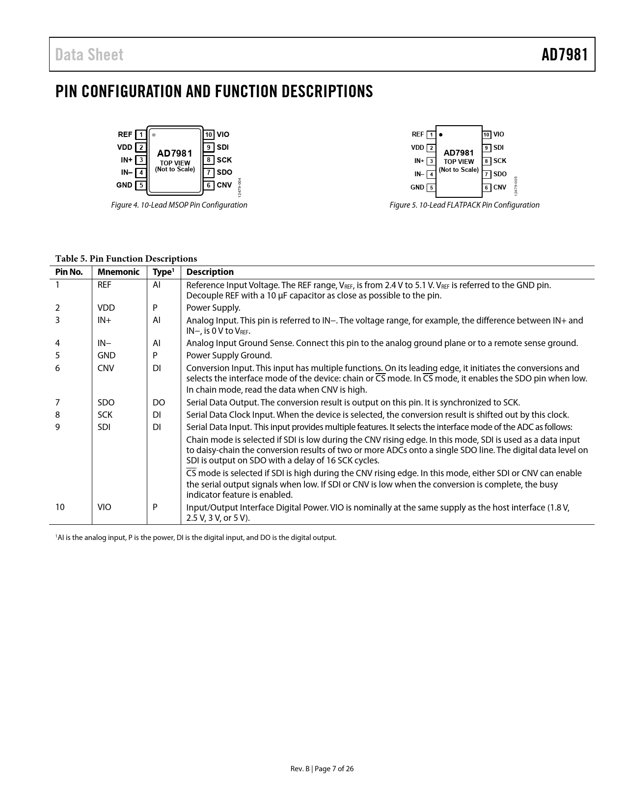 Data Sheet. AD7981. PIN CONFIGURATION AND FUNCTION DESCRIPTIONS. REF 1. 10 VIO. VDD 2. 9 SDI. IN+ 3. 8 SCK. TOP VIEW. IN–. (Not to Scale)
