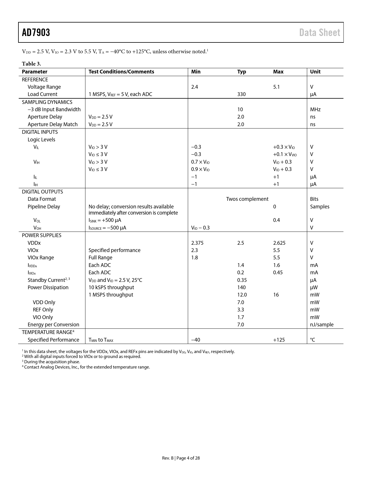 AD7903Data Sheet VDD = 2.5 V, VIO = 2.3 V to 5.5 V, TA = −40°C to +125°C, unless otherwise noted.1 Table 3. ParameterTest Conditions/CommentsMinTypMaxUnit REFERENCE Voltage Range 2.4 5.1 V Load Current 1 MSPS, VREF = 5 V, each ADC 330 µA SAMPLING DYNAMICS −3 dB Input Bandwidth 10 MHz Aperture Delay VDD = 2.5 V 2.0 ns Aperture Delay Match VDD = 2.5 V 2.0 ns DIGITAL INPUTS Logic Levels VIL VIO > 3 V −0.3 +0.3 × VIO V VIO ≤ 3 V −0.3 +0.1 × VVIO V VIH VIO > 3 V 0.7 × VIO VIO + 0.3 V VIO ≤ 3 V 0.9 × VIO VIO + 0.3 V IIL −1 +1 µA IIH −1 +1 µA DIGITAL OUTPUTS Data Format Twos complement Bits Pipeline Delay No delay; conversion results available 0 Samples immediately after conversion is complete VOL ISINK = +500 µA 0.4 V VOH ISOURCE = −500 µA VIO − 0.3 V POWER SUPPLIES VDDx 2.375 2.5 2.625 V VIOx Specified performance 2.3 5.5 V VIOx Range Full Range 1.8 5.5 V IVDDx Each ADC 1.4 1.6 mA IVIOx Each ADC 0.2 0.45 mA Standby Current2, 3 VDD and VIO = 2.5 V, 25°C 0.35 µA Power Dissipation 10 kSPS throughput 140 µW 1 MSPS throughput 12.0 16 mW VDD Only 7.0 mW REF Only 3.3 mW VIO Only 1.7 mW Energy per Conversion 7.0 nJ/sample TEMPERATURE RANGE4 Specified Performance TMIN to TMAX −40 +125 °C 1 In this data sheet, the voltages for the VDDx, VIOx, and REFx pins are indicated by VDD, VIO, and VREF, respectively. 2 With all digital inputs forced to VIOx or to ground as required. 3 During the acquisition phase. 4 Contact Analog Devices, Inc., for the extended temperature range. Rev. B | Page 4 of 28 Document Outline Features Applications General Description Functional Block Diagram Table of Contents Revision History Specifications Timing Specifications Absolute Maximum Ratings ESD Caution Pin Configuration and Function Descriptions Typical Performance Characteristics Terminology Theory of Operation Circuit Information Converter Operation Transfer Functions Typical Connection Diagram Analog Inputs Driver Amplifier Choice Single-to-Differential Driver Voltage Reference Input Power Supply Digital Interface CS Mode CS Mode, 3-Wire Interface Without Busy Indicator CS Mode, 3-Wire Interface with Busy Indicator CS Mode, 4-Wire Interface Without Busy Indicator CS Mode, 4-Wire Interface with Busy Indicator Chain Mode Chain Mode Without Busy Indicator Chain Mode with Busy Indicator Applications Information Simultaneous Sampling Functional Safety Considerations Layout Evaluating Performance of the AD7903 Outline Dimensions Ordering Guide