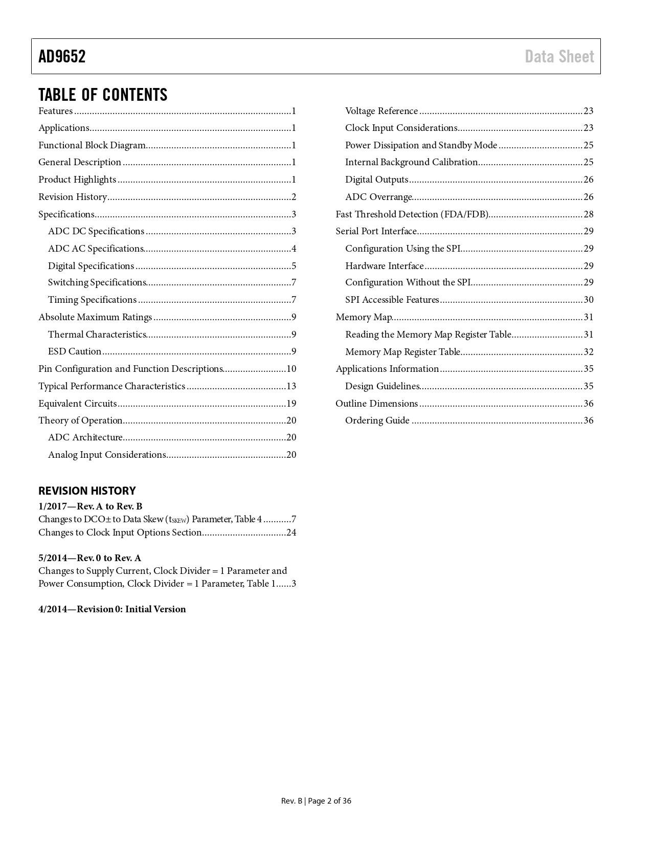 link to page 1 link to page 1 link to page 1 link to page 1 link to page 1 link to page 3 link to page 4 link to page 4 link to page 5 link to page 6 link to page 7 link to page 8 link to page 10 link to page 10 link to page 10 link to page 11 link to page 14 link to page 20 link to page 21 link to page 21 link to page 21 link to page 24 link to page 24 link to page 26 link to page 26 link to page 27 link to page 27 link to page 29 link to page 30 link to page 30 link to page 30 link to page 30 link to page 31 link to page 32 link to page 32 link to page 33 link to page 36 link to page 36 link to page 37 link to page 37 AD9652Data SheetTABLE OF CONTENTS Features ...1 Voltage Reference .. 23 Applications...1 Clock Input Considerations ... 23 Functional Block Diagram ...1 Power Dissipation and Standby Mode ... 25 General Description ..1 Internal Background Calibration ... 25 Product Highlights ..1 Digital Outputs .. 26 Revision History ..2 ADC Overrange... 26 Specifications ...3 Fast Threshold Detection (FDA/FDB)... 28 ADC DC Specifications ...3 Serial Port Interface ... 29 ADC AC Specifications..4 Configuration Using the SPI .. 29 Digital Specifications ...5 Hardware Interface .. 29 Switching Specifications...7 Configuration Without the SPI.. 29 Timing Specifications ..7 SPI Accessible Features .. 30 Absolute Maximum Ratings ..9 Memory Map... 31 Thermal Characteristics...9 Reading the Memory Map Register Table .. 31 ESD Caution ..9 Memory Map Register Table .. 32 Pin Configuration and Function Descriptions...10 Applications Information .. 35 Typical Performance Characteristics ...13 Design Guidelines.. 35 Equivalent Circuits ..19 Outline Dimensions .. 36 Theory of Operation ..20 Ordering Guide ... 36 ADC Architecture ..20 Analog Input Considerations ...20 REVISION HISTORY 1/2017—Rev. A to Rev. B Changes to DCO± to Data Skew (tSKEW) Parameter, Table 4 ...7 Changes to Clock Input Options Section ...24 5/2014—Rev. 0 to Rev. A Changes to Supply Current, Clock Divider = 1 Parameter and Power Consumption, Clock Divider = 1 Parameter, Table 1 ..3 4/2014—Revision 0: Initial Version Rev. B | Page 2 of 36 Document Outline Features Applications Functional Block Diagram General Description Product Highlights Revision History Specifications ADC DC Specifications ADC AC Specifications Digital Specifications Switching Specifications Timing Specifications Timing Diagrams Absolute Maximum Ratings Thermal Characteristics ESD Caution Pin Configuration and Function Descriptions Typical Performance Characteristics Equivalent Circuits Theory of Operation ADC Architecture Analog Input Considerations Input Common Mode Common-Mode Voltage Servo Dither Large Signal Fast Fourier Transform Small Signal FFT Static Linearity Differential Input Configurations Voltage Reference Internal Reference Connection External Reference Operation Clock Input Considerations Clock Input Options Input Clock Divider Clock Duty Cycle Jitter Considerations Power Dissipation and Standby Mode Internal Background Calibration Digital Outputs Timing Data Clock Output ADC Overrange Fast Threshold Detection (FDA/FDB) Serial Port Interface Configuration Using the SPI Hardware Interface Configuration Without the SPI SPI Accessible Features Memory Map Reading the Memory Map Register Table Open and Reserved Locations Default Values Logic Levels Transfer Register Map Channel Specific Registers Memory Map Register Table Applications Information Design Guidelines Power and Ground Recommendations VCM RBIAS Reference Decoupling SPI Port Outline Dimensions Ordering Guide