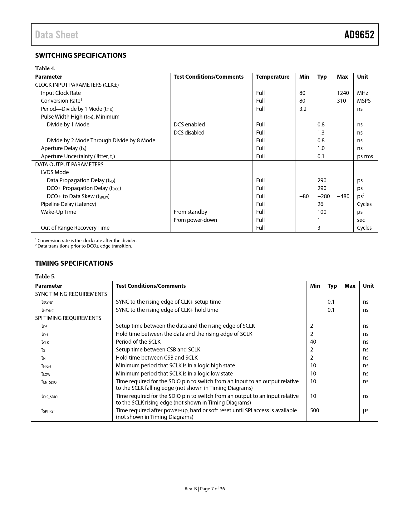 Data Sheet. AD9652. SWITCHING SPECIFICATIONS. Table 4. Parameter Test. Conditions/Comments. Temperature. Min. Typ. Max. Unit