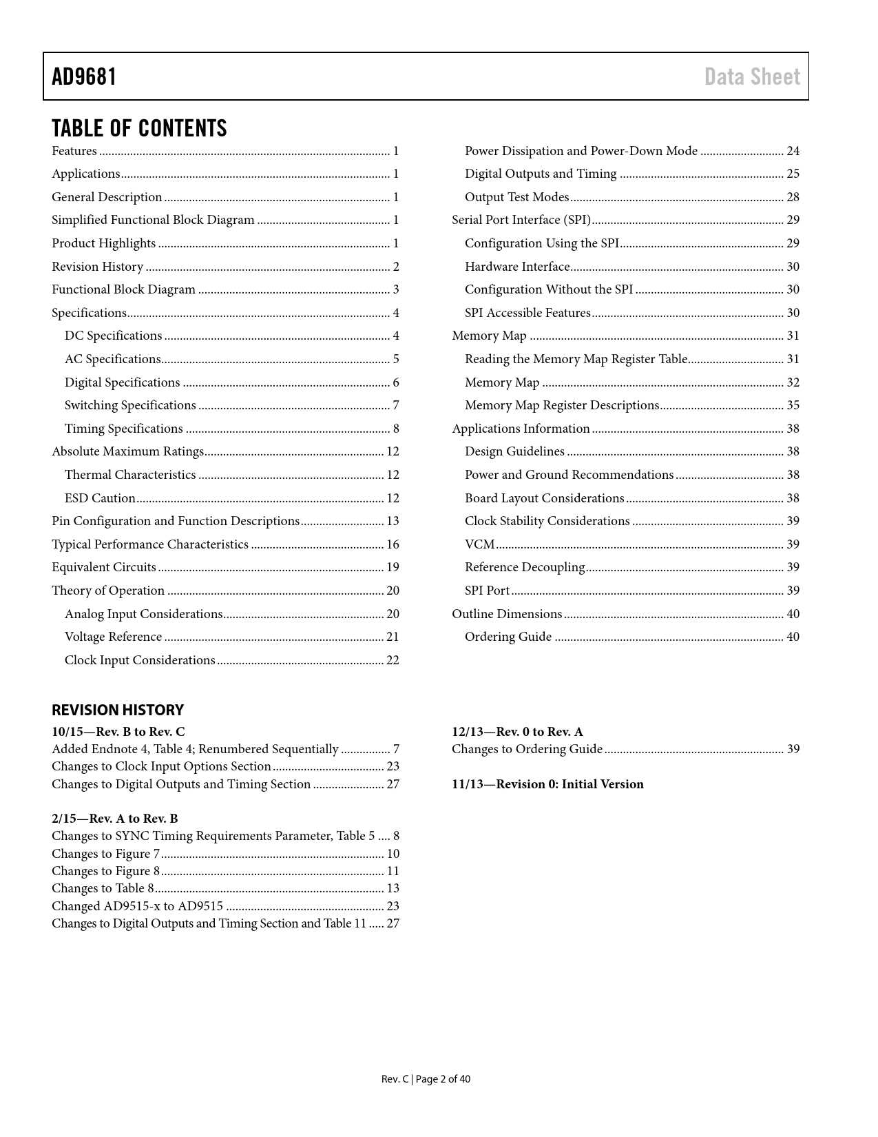 link to page 1 link to page 1 link to page 1 link to page 1 link to page 1 link to page 3 link to page 4 link to page 5 link to page 5 link to page 6 link to page 7 link to page 8 link to page 9 link to page 13 link to page 13 link to page 13 link to page 14 link to page 17 link to page 20 link to page 21 link to page 21 link to page 22 link to page 23 link to page 25 link to page 26 link to page 29 link to page 30 link to page 30 link to page 31 link to page 31 link to page 31 link to page 32 link to page 32 link to page 33 link to page 36 link to page 39 link to page 39 link to page 39 link to page 39 link to page 40 link to page 40 link to page 40 link to page 40 link to page 41 link to page 41 AD9681Data SheetTABLE OF CONTENTS Features .. 1 Power Dissipation and Power-Down Mode ... 24 Applications ... 1 Digital Outputs and Timing ... 25 General Description ... 1 Output Test Modes ... 28 Simplified Functional Block Diagram ... 1 Serial Port Interface (SPI) .. 29 Product Highlights ... 1 Configuration Using the SPI ... 29 Revision History ... 2 Hardware Interface ... 30 Functional Block Diagram .. 3 Configuration Without the SPI .. 30 Specifications ... 4 SPI Accessible Features .. 30 DC Specifications ... 4 Memory Map .. 31 AC Specifications .. 5 Reading the Memory Map Register Table ... 31 Digital Specifications ... 6 Memory Map .. 32 Switching Specifications .. 7 Memory Map Register Descriptions .. 35 Timing Specifications .. 8 Applications Information .. 38 Absolute Maximum Ratings .. 12 Design Guidelines .. 38 Thermal Characteristics .. 12 Power and Ground Recommendations ... 38 ESD Caution .. 12 Board Layout Considerations ... 38 Pin Configuration and Function Descriptions ... 13 Clock Stability Considerations ... 39 Typical Performance Characteristics ... 16 VCM ... 39 Equivalent Circuits ... 19 Reference Decoupling .. 39 Theory of Operation .. 20 SPI Port .. 39 Analog Input Considerations .. 20 Outline Dimensions ... 40 Voltage Reference ... 21 Ordering Guide .. 40 Clock Input Considerations .. 22 REVISION HISTORY10/15—Rev. B to Rev. C12/13—Rev. 0 to Rev. A Added Endnote 4, Table 4; Renumbered Sequentially .. 7 Changes to Ordering Guide .. 39 Changes to Clock Input Options Section .. 23 Changes to Digital Outputs and Timing Section ... 27 11/13—Revision 0: Initial Version2/15—Rev. A to Rev. B Changes to SYNC Timing Requirements Parameter, Table 5 .. 8 Changes to Figure 7 .. 10 Changes to Figure 8 .. 11 Changes to Table 8 .. 13 Changed AD9515-x to AD9515 ... 23 Changes to Digital Outputs and Timing Section and Table 11 ... 27 Rev. C | Page 2 of 40 Document Outline FEATURES APPLICATIONS GENERAL DESCRIPTION SIMPLIFIED FUNCTIONAL BLOCK DIAGRAM PRODUCT HIGHLIGHTS TABLE OF CONTENTS REVISION HISTORY FUNCTIONAL BLOCK DIAGRAM SPECIFICATIONS DC SPECIFICATIONS AC SPECIFICATIONS DIGITAL SPECIFICATIONS SWITCHING SPECIFICATIONS TIMING SPECIFICATIONS Timing Diagrams ABSOLUTE MAXIMUM RATINGS THERMAL CHARACTERISTICS ESD CAUTION PIN CONFIGURATION AND FUNCTION DESCRIPTIONS TYPICAL PERFORMANCE CHARACTERISTICS EQUIVALENT CIRCUITS THEORY OF OPERATION ANALOG INPUT CONSIDERATIONS Input Common Mode Differential Input Configurations VOLTAGE REFERENCE Internal Reference Connection External Reference Operation CLOCK INPUT CONSIDERATIONS Clock Input Options Input Clock Divider Clock Duty Cycle Jitter Considerations POWER DISSIPATION AND POWER-DOWN MODE DIGITAL OUTPUTS AND TIMING SDIO/OLM Pin SCLK/DTP Pin CSB1 and CSB2 Pins RBIAS1 and RBIAS2 Pins OUTPUT TEST MODES SERIAL PORT INTERFACE (SPI) CONFIGURATION USING THE SPI HARDWARE INTERFACE CONFIGURATION WITHOUT THE SPI SPI ACCESSIBLE FEATURES MEMORY MAP READING THE MEMORY MAP REGISTER TABLE Open Locations Default Values Logic Levels Channel Specific Registers MEMORY MAP MEMORY MAP REGISTER DESCRIPTIONS Device Index (Register 0x05) Transfer (Register 0xFF) Power Modes (Register 0x08) Enhancement Control (Register 0x0C) Output Mode (Register 0x14) Output Adjust (Register 0x15) Output Phase (Register 0x16) Serial Output Data Control (Register 0x21) Resolution/Sample Rate Override (Register 0x100) User I/O Control 2 (Register 0x101) User I/O Control 3 (Register 0x102) APPLICATIONS INFORMATION DESIGN GUIDELINES POWER AND GROUND RECOMMENDATIONS BOARD LAYOUT CONSIDERATIONS Sources of Coupling Crosstalk Between Inputs Coupling of Digital Output Switching Noise to Analog Inputs and Clock CLOCK STABILITY CONSIDERATIONS VCM REFERENCE DECOUPLING SPI PORT OUTLINE DIMENSIONS ORDERING GUIDE