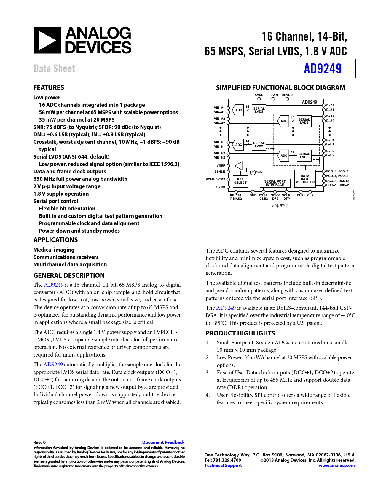 16 Channel, 14-Bit,. 65 MSPS, Serial LVDS, 1.8 V ADC. Data Sheet. AD9249. FEATURES. SIMPLIFIED FUNCTIONAL BLOCK DIAGRAM. Low power