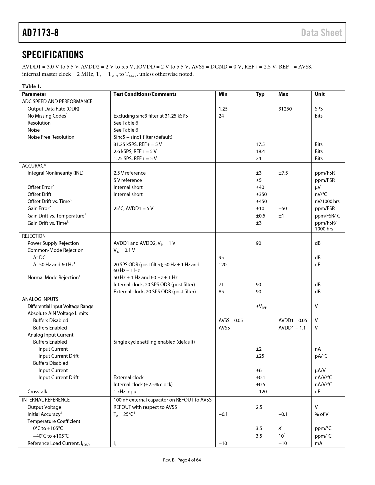 AD7173-8. Data Sheet. SPECIFICATIONS. Table 1. Parameter. Test Conditions/Comments. Min. Typ. Max. Unit