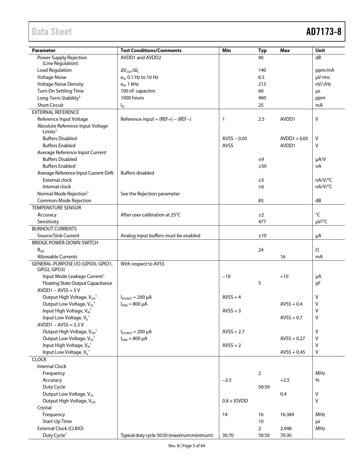 Pages / Page64 / 5 — Data Sheet. AD7173-8. Parameter. Test Conditions/Comments. Min. Typ. Max. …
