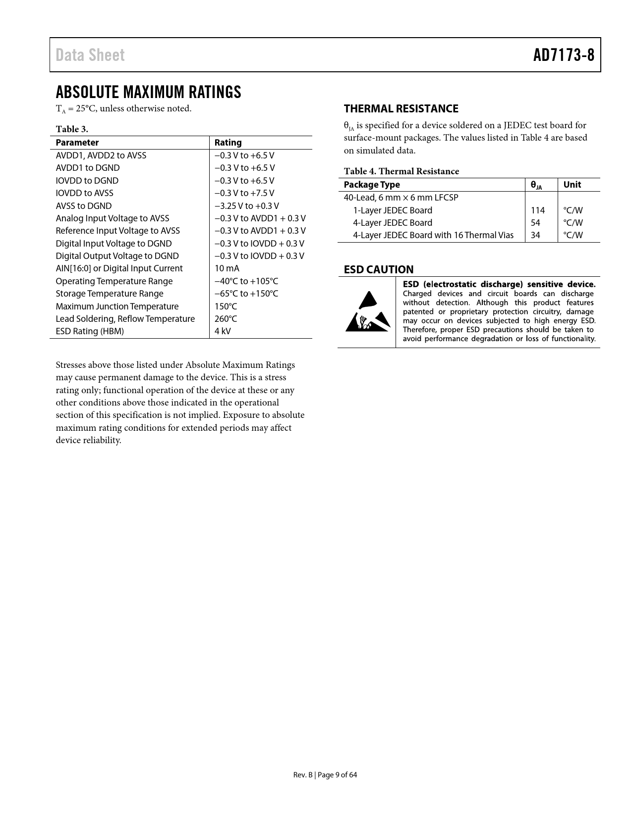 Pages / Page64 / 9 — Data Sheet. AD7173-8. ABSOLUTE MAXIMUM RATINGS. THERMAL RESISTANCE. Table …