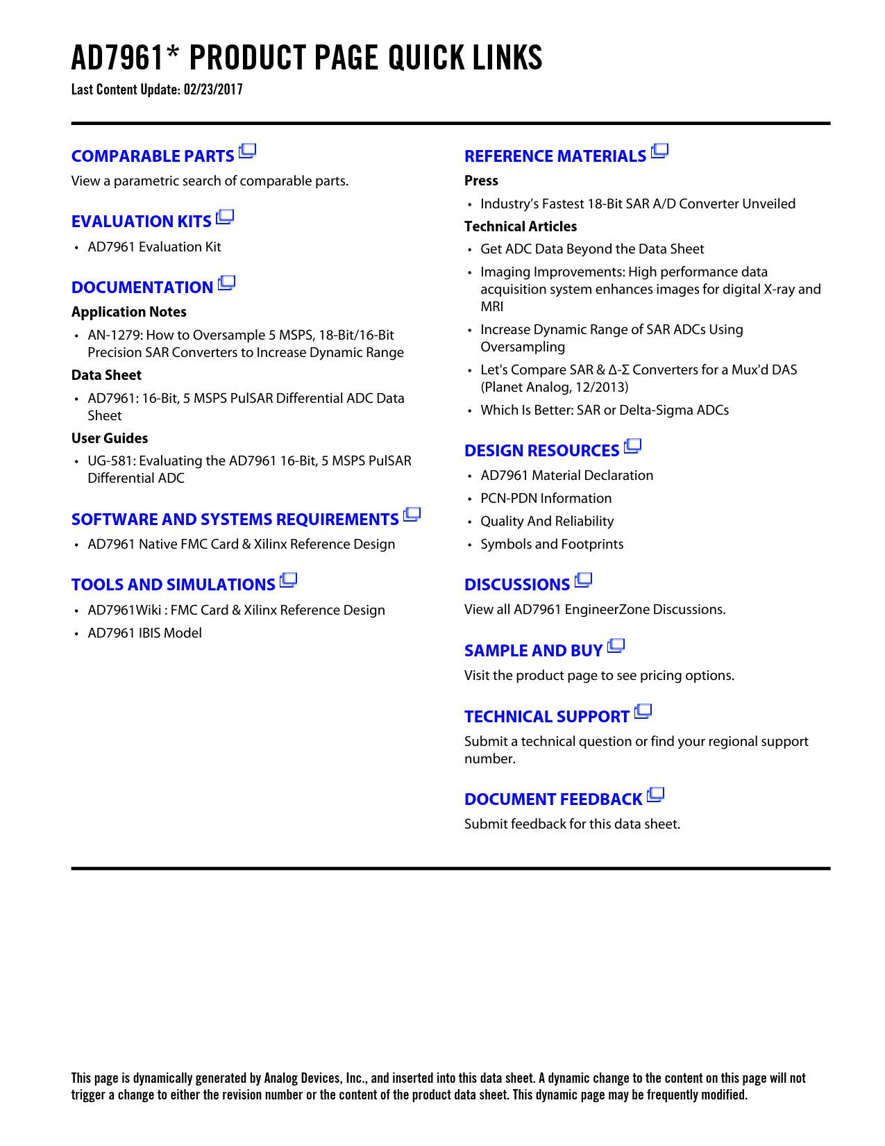 • UG-581: Evaluating the AD7961 16-Bit, 5 MSPS PulSAR Differential ADC • AD7961 Material Declaration • PCN-PDN Information