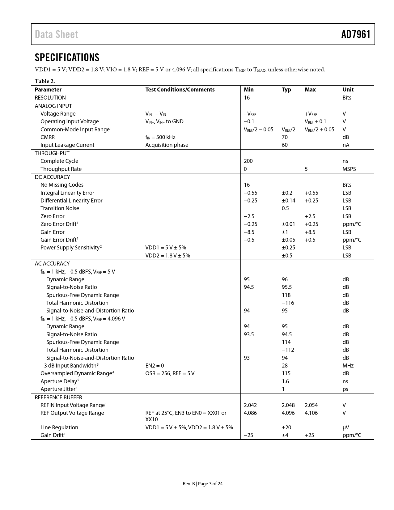 Data Sheet. AD7961. SPECIFICATIONS. Table 2. Parameter. Test Conditions/Comments. Min. Typ. Max. Unit