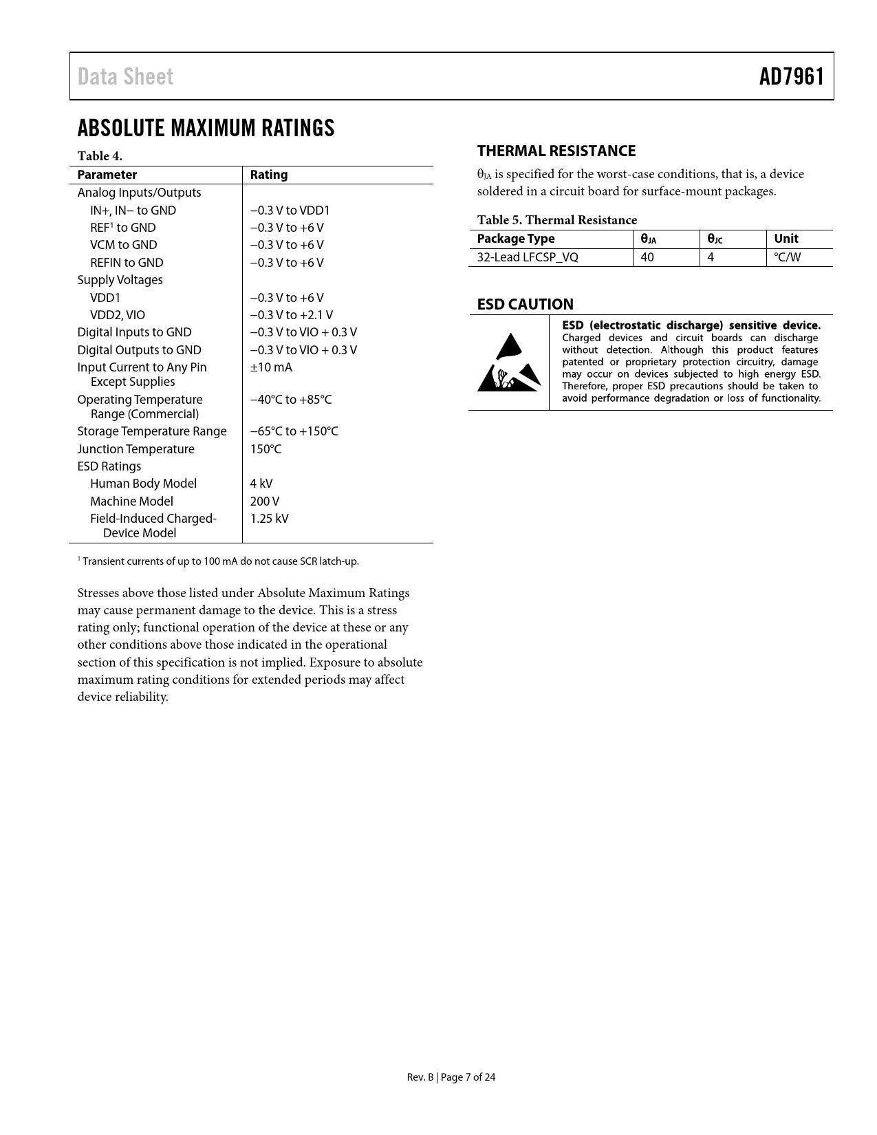 Data Sheet. AD7961. ABSOLUTE MAXIMUM RATINGS Table 4. THERMAL RESISTANCE. Parameter Rating. Table 5. Thermal Resistance