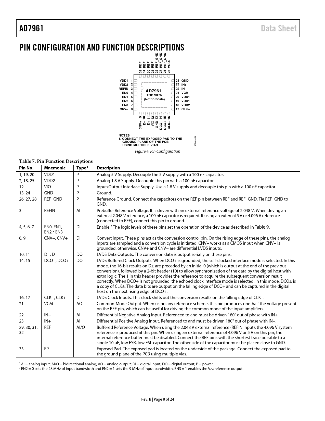 AD7961. Data Sheet. PIN CONFIGURATION AND FUNCTION DESCRIPTIONS. DD2. VDD1 1. 24 GND. VDD2 2. 23 IN+. REFIN 3. 22 IN–. EN0 4. 21 VCM. TOP VIEW