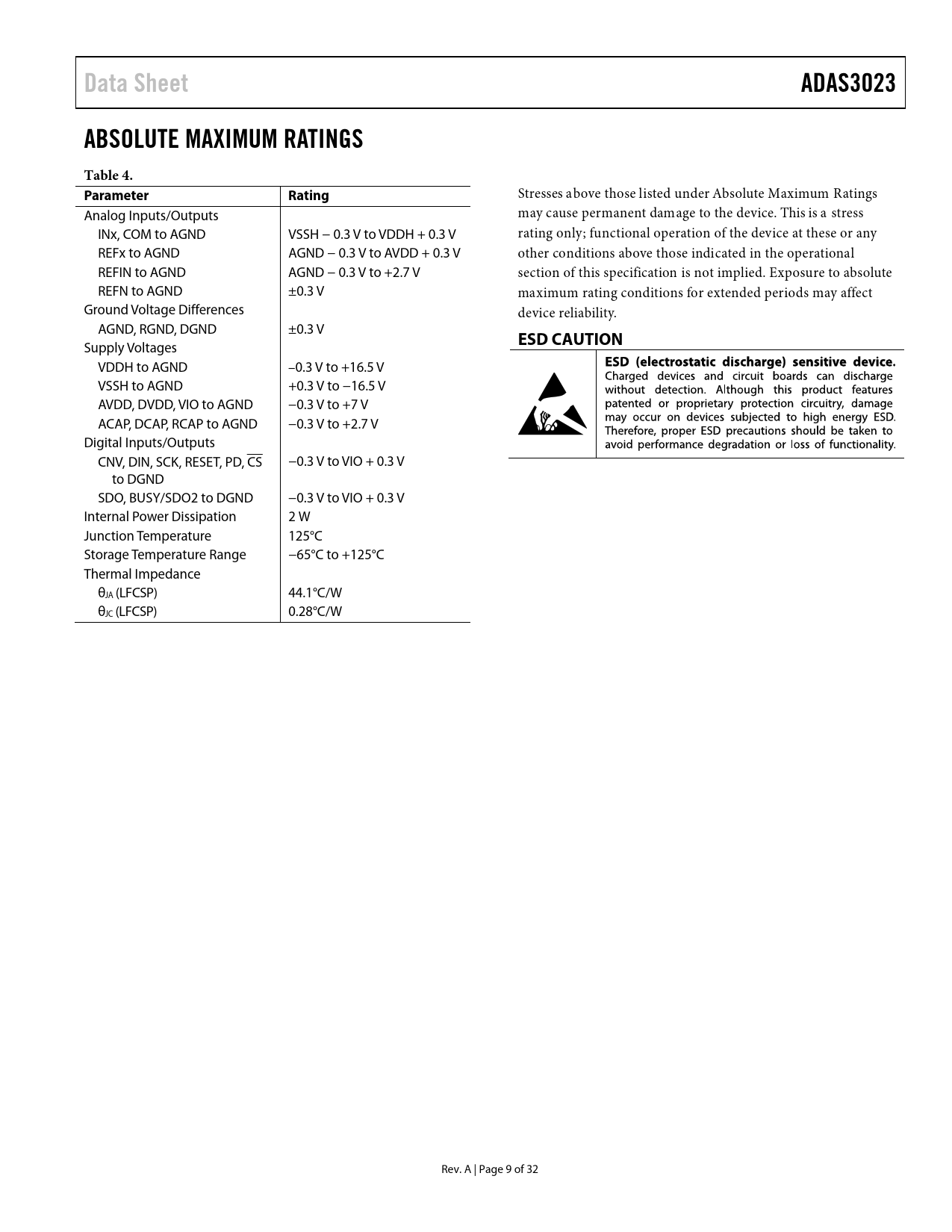 Data Sheet ADAS3023 ABSOLUTE MAXIMUM RATINGS Table 4 Parameter Rating ESD CAUTION