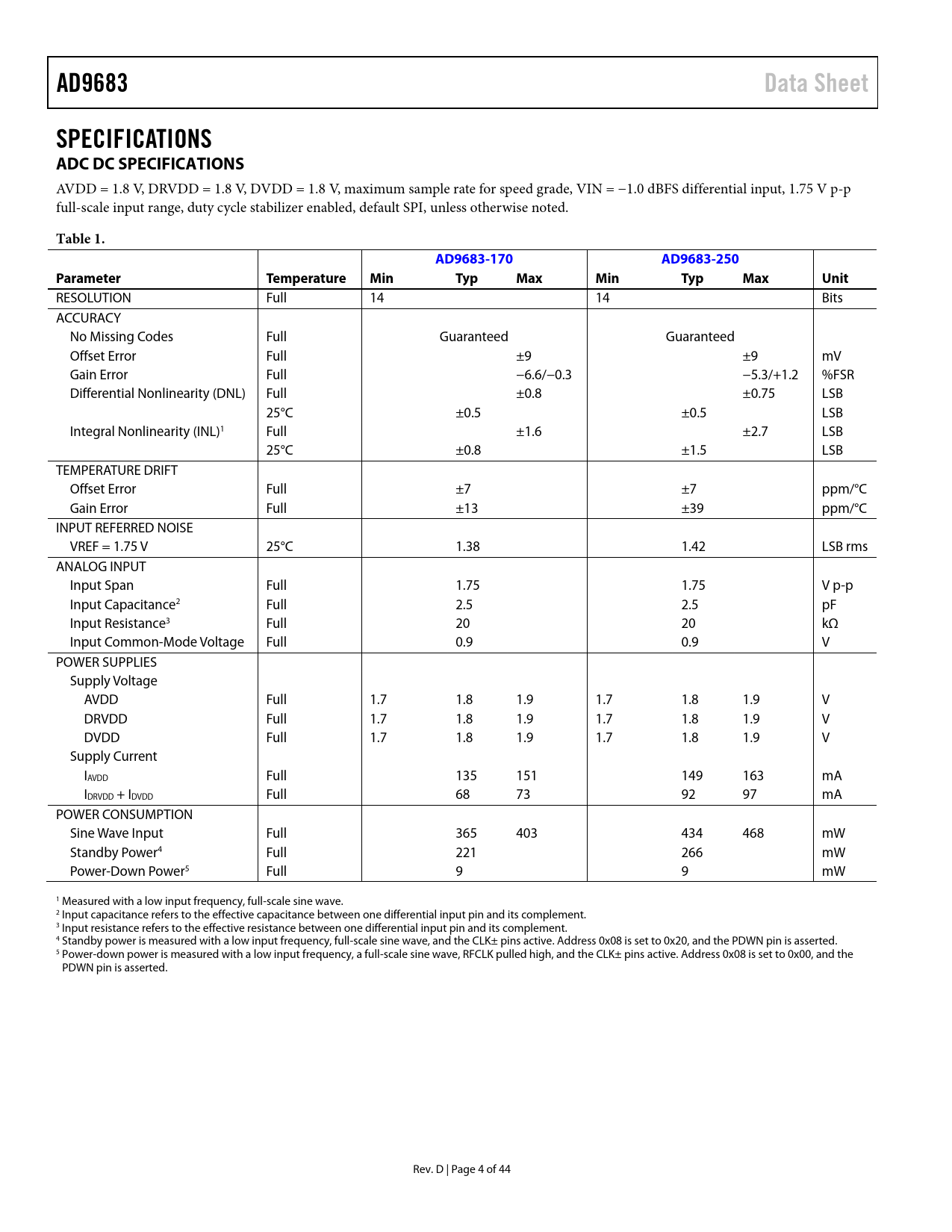 AD9683Data SheetSPECIFICATIONS ADC DC SPECIFICATIONS AVDD = 1.8 V, DRVDD = 1.8 V, DVDD = 1.8 V, maximum sample rate for speed grade, VIN = −1.0 dBFS differential input, 1.75 V p-p full-scale input range, duty cycle stabilizer enabled, default SPI, unless otherwise noted. Table 1.AD9683-170AD9683-250ParameterTemperatureMinTypMaxMinTypMaxUnit RESOLUTION Full 14 14 Bits ACCURACY No Missing Codes Full Guaranteed Guaranteed Offset Error Full ±9 ±9 mV Gain Error Full −6.6/−0.3 −5.3/+1.2 %FSR Differential Nonlinearity (DNL) Full ±0.8 ±0.75 LSB 25°C ±0.5 ±0.5 LSB Integral Nonlinearity (INL)1 Full ±1.6 ±2.7 LSB 25°C ±0.8 ±1.5 LSB TEMPERATURE DRIFT Offset Error Full ±7 ±7 ppm/°C Gain Error Full ±13 ±39 ppm/°C INPUT REFERRED NOISE VREF = 1.75 V 25°C 1.38 1.42 LSB rms ANALOG INPUT Input Span Full 1.75 1.75 V p-p Input Capacitance2 Full 2.5 2.5 pF Input Resistance3 Full 20 20 kΩ Input Common-Mode Voltage Full 0.9 0.9 V POWER SUPPLIES Supply Voltage AVDD Full 1.7 1.8 1.9 1.7 1.8 1.9 V DRVDD Full 1.7 1.8 1.9 1.7 1.8 1.9 V DVDD Full 1.7 1.8 1.9 1.7 1.8 1.9 V Supply Current IAVDD Full 135 151 149 163 mA IDRVDD + IDVDD Full 68 73 92 97 mA POWER CONSUMPTION Sine Wave Input Full 365 403 434 468 mW Standby Power4 Full 221 266 mW Power-Down Power5 Full 9 9 mW 1 Measured with a low input frequency, full-scale sine wave. 2 Input capacitance refers to the effective capacitance between one differential input pin and its complement. 3 Input resistance refers to the effective resistance between one differential input pin and its complement. 4 Standby power is measured with a low input frequency, full-scale sine wave, and the CLK± pins active. Address 0x08 is set to 0x20, and the PDWN pin is asserted. 5 Power-down power is measured with a low input frequency, a full-scale sine wave, RFCLK pulled high, and the CLK± pins active. Address 0x08 is set to 0x00, and the PDWN pin is asserted. Rev. D | Page 4 of 44 Document Outline FEATURES APPLICATIONS FUNCTIONAL BLOCK DIAGRAM GENERAL DESCRIPTION TABLE OF CONTENTS REVISION HISTORY PRODUCT HIGHLIGHTS SPECIFICATIONS ADC DC SPECIFICATIONS ADC AC SPECIFICATIONS DIGITAL SPECIFICATIONS SWITCHING SPECIFICATIONS TIMING SPECIFICATIONS Timing Diagrams ABSOLUTE MAXIMUM RATINGS THERMAL CHARACTERISTICS ESD CAUTION PIN CONFIGURATION AND FUNCTION DESCRIPTIONS TYPICAL PERFORMANCE CHARACTERISTICS EQUIVALENT CIRCUITS THEORY OF OPERATION ADC ARCHITECTURE ANALOG INPUT CONSIDERATIONS Input Common Mode Differential Input Configurations VOLTAGE REFERENCE CLOCK INPUT CONSIDERATIONS Nyquist Clock Input Options RF Clock Input Options Input Clock Divider Clock Duty Cycle Jitter Considerations POWER DISSIPATION AND STANDBY MODE DIGITAL OUTPUTS JESD204B TRANSMIT TOP LEVEL DESCRIPTION JESD204B Overview JESD204B Synchronization Details CGS Phase ILAS Phase Data Transmission Phase Link Setup Parameters Disable Lane Before Changing Configuration Configure Detailed Options Check FCHK, Checksum of JESD204B Interface Parameters Set Additional Digital Output Configuration Options Reenable Lane After Configuration Frame and Lane Alignment Monitoring and Correction Digital Outputs and Timing ADC OVERRANGE AND GAIN CONTROL ADC Overrange (OR) Gain Switching Fast Threshold Detection (FD) DC CORRECTION (DCC) DC CORRECTION BANDWIDTH DC CORRECTION READBACK DC CORRECTION FREEZE DC CORRECTION ENABLE BITS SERIAL PORT INTERFACE (SPI) CONFIGURATION USING THE SPI HARDWARE INTERFACE SPI ACCESSIBLE FEATURES MEMORY MAP READING THE MEMORY MAP REGISTER TABLE Open and Reserved Locations Default Values Logic Levels Transfer Register Map MEMORY MAP REGISTER TABLE MEMORY MAP REGISTER DESCRIPTIONS PDWN Modes (Address 0x08) Output Mode (Address 0x14) SYNCINB±/SYSREF± Control (Address 0x3A) DC Correction Control (Address 0x40) DC Correction Value 0 (Address 0x41) DC Correction Value 1 (Address 0x42) Fast Detect Control (Address 0x45) Fast Detect Upper Threshold (Address 0x47 and Address 0x48) Fast Detect Lower Threshold (Address 0x49 and Address 0x4A) Fast Detect Dwell Time (Address 0x4B and Address 0x4C) JESD204B Quick Configuration (Address 0x5E) JESD204B Link Control 1 (Address 0x5F) JESD204B Link Control 2 (Address 0x60) JESD204B Link Control 3 (Address 0x61) JESD204B Device Identification (DID) Configuration (Address 0x64) JESD204B Bank Identification (BID) Configuration (Address 0x65) JESD204B Lane Identification (LID) Configuration (Address 0x67) JESD204B Scrambler (SCR) and Lane (L) Configuration (Address 0x6E) JESD204B Parameter, F (Address 0x6F, Read Only) JESD204B Parameter, K (Address 0x70) JESD204B Parameter, M (Address 0x71) JESD204B Parameters, N/CS (Address 0x72) JESD204B Parameter, Subclass/N’ (Address 0x73) JESD204B Samples per Converter per Frame Cycle (S) (Address 0x74) JESD204B Parameters HD and CF (Address 0x75) JESD204B Reserved 1 (Address 0x76) JESD204B Reserved 2 (Address 0x77) JESD204B Checksum (Address 0x79) JESD204B Output Driver Control (Address 0x80) JESD204B LMFC Offset (Address 0x8B) JESD204B Preemphasis (Address 0xA8) APPLICATIONS INFORMATION DESIGN GUIDELINES Power and Ground Recommendations Exposed Pad Thermal Heat Slug Recommendations VCM SPI Port OUTLINE DIMENSIONS ORDERING GUIDE