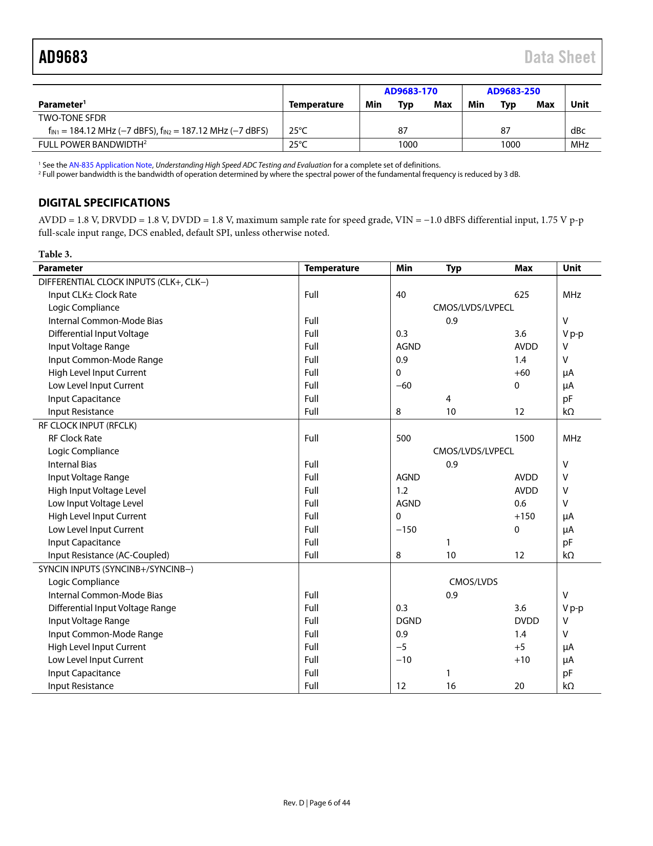 AD9683Data SheetAD9683-170AD9683-250Parameter1TemperatureMinTypMaxMinTypMaxUnit TWO-TONE SFDR fIN1 = 184.12 MHz (−7 dBFS), fIN2 = 187.12 MHz (−7 dBFS) 25°C 87 87 dBc FULL POWER BANDWIDTH2 25°C 1000 1000 MHz 1 See the AN-835 Application Note, Understanding High Speed ADC Testing and Evaluation for a complete set of definitions. 2 Full power bandwidth is the bandwidth of operation determined by where the spectral power of the fundamental frequency is reduced by 3 dB. DIGITAL SPECIFICATIONS AVDD = 1.8 V, DRVDD = 1.8 V, DVDD = 1.8 V, maximum sample rate for speed grade, VIN = −1.0 dBFS differential input, 1.75 V p-p full-scale input range, DCS enabled, default SPI, unless otherwise noted. Table 3. ParameterTemperatureMinTypMaxUnit DIFFERENTIAL CLOCK INPUTS (CLK+, CLK−) Input CLK± Clock Rate Full 40 625 MHz Logic Compliance CMOS/LVDS/LVPECL Internal Common-Mode Bias Full 0.9 V Differential Input Voltage Full 0.3 3.6 V p-p Input Voltage Range Full AGND AVDD V Input Common-Mode Range Full 0.9 1.4 V High Level Input Current Full 0 +60 µA Low Level Input Current Full −60 0 µA Input Capacitance Full 4 pF Input Resistance Full 8 10 12 kΩ RF CLOCK INPUT (RFCLK) RF Clock Rate Full 500 1500 MHz Logic Compliance CMOS/LVDS/LVPECL Internal Bias Full 0.9 V Input Voltage Range Full AGND AVDD V High Input Voltage Level Full 1.2 AVDD V Low Input Voltage Level Full AGND 0.6 V High Level Input Current Full 0 +150 µA Low Level Input Current Full −150 0 µA Input Capacitance Full 1 pF Input Resistance (AC-Coupled) Full 8 10 12 kΩ SYNCIN INPUTS (SYNCINB+/SYNCINB−) Logic Compliance CMOS/LVDS Internal Common-Mode Bias Full 0.9 V Differential Input Voltage Range Full 0.3 3.6 V p-p Input Voltage Range Full DGND DVDD V Input Common-Mode Range Full 0.9 1.4 V High Level Input Current Full −5 +5 µA Low Level Input Current Full −10 +10 µA Input Capacitance Full 1 pF Input Resistance Full 12 16 20 kΩ Rev. D | Page 6 of 44 Document Outline FEATURES APPLICATIONS FUNCTIONAL BLOCK DIAGRAM GENERAL DESCRIPTION TABLE OF CONTENTS REVISION HISTORY PRODUCT HIGHLIGHTS SPECIFICATIONS ADC DC SPECIFICATIONS ADC AC SPECIFICATIONS DIGITAL SPECIFICATIONS SWITCHING SPECIFICATIONS TIMING SPECIFICATIONS Timing Diagrams ABSOLUTE MAXIMUM RATINGS THERMAL CHARACTERISTICS ESD CAUTION PIN CONFIGURATION AND FUNCTION DESCRIPTIONS TYPICAL PERFORMANCE CHARACTERISTICS EQUIVALENT CIRCUITS THEORY OF OPERATION ADC ARCHITECTURE ANALOG INPUT CONSIDERATIONS Input Common Mode Differential Input Configurations VOLTAGE REFERENCE CLOCK INPUT CONSIDERATIONS Nyquist Clock Input Options RF Clock Input Options Input Clock Divider Clock Duty Cycle Jitter Considerations POWER DISSIPATION AND STANDBY MODE DIGITAL OUTPUTS JESD204B TRANSMIT TOP LEVEL DESCRIPTION JESD204B Overview JESD204B Synchronization Details CGS Phase ILAS Phase Data Transmission Phase Link Setup Parameters Disable Lane Before Changing Configuration Configure Detailed Options Check FCHK, Checksum of JESD204B Interface Parameters Set Additional Digital Output Configuration Options Reenable Lane After Configuration Frame and Lane Alignment Monitoring and Correction Digital Outputs and Timing ADC OVERRANGE AND GAIN CONTROL ADC Overrange (OR) Gain Switching Fast Threshold Detection (FD) DC CORRECTION (DCC) DC CORRECTION BANDWIDTH DC CORRECTION READBACK DC CORRECTION FREEZE DC CORRECTION ENABLE BITS SERIAL PORT INTERFACE (SPI) CONFIGURATION USING THE SPI HARDWARE INTERFACE SPI ACCESSIBLE FEATURES MEMORY MAP READING THE MEMORY MAP REGISTER TABLE Open and Reserved Locations Default Values Logic Levels Transfer Register Map MEMORY MAP REGISTER TABLE MEMORY MAP REGISTER DESCRIPTIONS PDWN Modes (Address 0x08) Output Mode (Address 0x14) SYNCINB±/SYSREF± Control (Address 0x3A) DC Correction Control (Address 0x40) DC Correction Value 0 (Address 0x41) DC Correction Value 1 (Address 0x42) Fast Detect Control (Address 0x45) Fast Detect Upper Threshold (Address 0x47 and Address 0x48) Fast Detect Lower Threshold (Address 0x49 and Address 0x4A) Fast Detect Dwell Time (Address 0x4B and Address 0x4C) JESD204B Quick Configuration (Address 0x5E) JESD204B Link Control 1 (Address 0x5F) JESD204B Link Control 2 (Address 0x60) JESD204B Link Control 3 (Address 0x61) JESD204B Device Identification (DID) Configuration (Address 0x64) JESD204B Bank Identification (BID) Configuration (Address 0x65) JESD204B Lane Identification (LID) Configuration (Address 0x67) JESD204B Scrambler (SCR) and Lane (L) Configuration (Address 0x6E) JESD204B Parameter, F (Address 0x6F, Read Only) JESD204B Parameter, K (Address 0x70) JESD204B Parameter, M (Address 0x71) JESD204B Parameters, N/CS (Address 0x72) JESD204B Parameter, Subclass/N’ (Address 0x73) JESD204B Samples per Converter per Frame Cycle (S) (Address 0x74) JESD204B Parameters HD and CF (Address 0x75) JESD204B Reserved 1 (Address 0x76) JESD204B Reserved 2 (Address 0x77) JESD204B Checksum (Address 0x79) JESD204B Output Driver Control (Address 0x80) JESD204B LMFC Offset (Address 0x8B) JESD204B Preemphasis (Address 0xA8) APPLICATIONS INFORMATION DESIGN GUIDELINES Power and Ground Recommendations Exposed Pad Thermal Heat Slug Recommendations VCM SPI Port OUTLINE DIMENSIONS ORDERING GUIDE