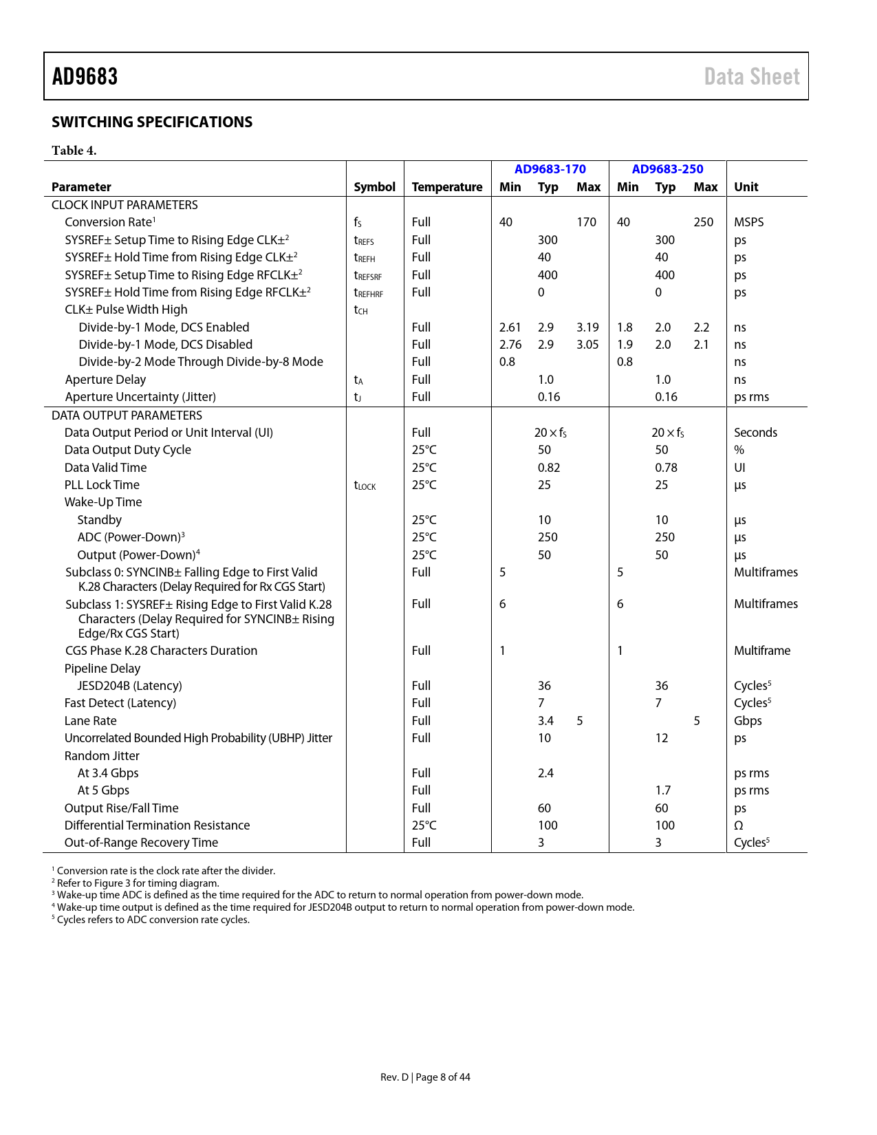 link to page 9 link to page 9 link to page 10 AD9683Data SheetSWITCHING SPECIFICATIONSTable 4.AD9683-170AD9683-250ParameterSymbol Temperature Min TypMax Min TypMax Unit CLOCK INPUT PARAMETERS Conversion Rate1 fS Full 40 170 40 250 MSPS SYSREF± Setup Time to Rising Edge CLK±2 tREFS Full 300 300 ps SYSREF± Hold Time from Rising Edge CLK±2 tREFH Full 40 40 ps SYSREF± Setup Time to Rising Edge RFCLK±2 tREFSRF Full 400 400 ps SYSREF± Hold Time from Rising Edge RFCLK±2 tREFHRF Full 0 0 ps CLK± Pulse Width High tCH Divide-by-1 Mode, DCS Enabled Full 2.61 2.9 3.19 1.8 2.0 2.2 ns Divide-by-1 Mode, DCS Disabled Full 2.76 2.9 3.05 1.9 2.0 2.1 ns Divide-by-2 Mode Through Divide-by-8 Mode Full 0.8 0.8 ns Aperture Delay tA Full 1.0 1.0 ns Aperture Uncertainty (Jitter) tJ Full 0.16 0.16 ps rms DATA OUTPUT PARAMETERS Data Output Period or Unit Interval (UI) Full 20 × fS 20 × fS Seconds Data Output Duty Cycle 25°C 50 50 % Data Valid Time 25°C 0.82 0.78 UI PLL Lock Time tLOCK 25°C 25 25 µs Wake-Up Time Standby 25°C 10 10 µs ADC (Power-Down)3 25°C 250 250 µs Output (Power-Down)4 25°C 50 50 µs Subclass 0: SYNCINB± Falling Edge to First Valid Full 5 5 Multiframes K.28 Characters (Delay Required for Rx CGS Start) Subclass 1: SYSREF± Rising Edge to First Valid K.28 Full 6 6 Multiframes Characters (Delay Required for SYNCINB± Rising Edge/Rx CGS Start) CGS Phase K.28 Characters Duration Full 1 1 Multiframe Pipeline Delay JESD204B (Latency) Full 36 36 Cycles5 Fast Detect (Latency) Full 7 7 Cycles5 Lane Rate Full 3.4 5 5 Gbps Uncorrelated Bounded High Probability (UBHP) Jitter Full 10 12 ps Random Jitter At 3.4 Gbps Full 2.4 ps rms At 5 Gbps Full 1.7 ps rms Output Rise/Fall Time Full 60 60 ps Differential Termination Resistance 25°C 100 100 Ω Out-of-Range Recovery Time Full 3 3 Cycles5 1 Conversion rate is the clock rate after the divider. 2 Refer to Figure 3 for timing diagram. 3 Wake-up time ADC is defined as the time required for the ADC to return to normal operation from power-down mode. 4 Wake-up time output is defined as the time required for JESD204B output to return to normal operation from power-down mode. 5 Cycles refers to ADC conversion rate cycles. Rev. D | Page 8 of 44 Document Outline FEATURES APPLICATIONS FUNCTIONAL BLOCK DIAGRAM GENERAL DESCRIPTION TABLE OF CONTENTS REVISION HISTORY PRODUCT HIGHLIGHTS SPECIFICATIONS ADC DC SPECIFICATIONS ADC AC SPECIFICATIONS DIGITAL SPECIFICATIONS SWITCHING SPECIFICATIONS TIMING SPECIFICATIONS Timing Diagrams ABSOLUTE MAXIMUM RATINGS THERMAL CHARACTERISTICS ESD CAUTION PIN CONFIGURATION AND FUNCTION DESCRIPTIONS TYPICAL PERFORMANCE CHARACTERISTICS EQUIVALENT CIRCUITS THEORY OF OPERATION ADC ARCHITECTURE ANALOG INPUT CONSIDERATIONS Input Common Mode Differential Input Configurations VOLTAGE REFERENCE CLOCK INPUT CONSIDERATIONS Nyquist Clock Input Options RF Clock Input Options Input Clock Divider Clock Duty Cycle Jitter Considerations POWER DISSIPATION AND STANDBY MODE DIGITAL OUTPUTS JESD204B TRANSMIT TOP LEVEL DESCRIPTION JESD204B Overview JESD204B Synchronization Details CGS Phase ILAS Phase Data Transmission Phase Link Setup Parameters Disable Lane Before Changing Configuration Configure Detailed Options Check FCHK, Checksum of JESD204B Interface Parameters Set Additional Digital Output Configuration Options Reenable Lane After Configuration Frame and Lane Alignment Monitoring and Correction Digital Outputs and Timing ADC OVERRANGE AND GAIN CONTROL ADC Overrange (OR) Gain Switching Fast Threshold Detection (FD) DC CORRECTION (DCC) DC CORRECTION BANDWIDTH DC CORRECTION READBACK DC CORRECTION FREEZE DC CORRECTION ENABLE BITS SERIAL PORT INTERFACE (SPI) CONFIGURATION USING THE SPI HARDWARE INTERFACE SPI ACCESSIBLE FEATURES MEMORY MAP READING THE MEMORY MAP REGISTER TABLE Open and Reserved Locations Default Values Logic Levels Transfer Register Map MEMORY MAP REGISTER TABLE MEMORY MAP REGISTER DESCRIPTIONS PDWN Modes (Address 0x08) Output Mode (Address 0x14) SYNCINB±/SYSREF± Control (Address 0x3A) DC Correction Control (Address 0x40) DC Correction Value 0 (Address 0x41) DC Correction Value 1 (Address 0x42) Fast Detect Control (Address 0x45) Fast Detect Upper Threshold (Address 0x47 and Address 0x48) Fast Detect Lower Threshold (Address 0x49 and Address 0x4A) Fast Detect Dwell Time (Address 0x4B and Address 0x4C) JESD204B Quick Configuration (Address 0x5E) JESD204B Link Control 1 (Address 0x5F) JESD204B Link Control 2 (Address 0x60) JESD204B Link Control 3 (Address 0x61) JESD204B Device Identification (DID) Configuration (Address 0x64) JESD204B Bank Identification (BID) Configuration (Address 0x65) JESD204B Lane Identification (LID) Configuration (Address 0x67) JESD204B Scrambler (SCR) and Lane (L) Configuration (Address 0x6E) JESD204B Parameter, F (Address 0x6F, Read Only) JESD204B Parameter, K (Address 0x70) JESD204B Parameter, M (Address 0x71) JESD204B Parameters, N/CS (Address 0x72) JESD204B Parameter, Subclass/N’ (Address 0x73) JESD204B Samples per Converter per Frame Cycle (S) (Address 0x74) JESD204B Parameters HD and CF (Address 0x75) JESD204B Reserved 1 (Address 0x76) JESD204B Reserved 2 (Address 0x77) JESD204B Checksum (Address 0x79) JESD204B Output Driver Control (Address 0x80) JESD204B LMFC Offset (Address 0x8B) JESD204B Preemphasis (Address 0xA8) APPLICATIONS INFORMATION DESIGN GUIDELINES Power and Ground Recommendations Exposed Pad Thermal Heat Slug Recommendations VCM SPI Port OUTLINE DIMENSIONS ORDERING GUIDE