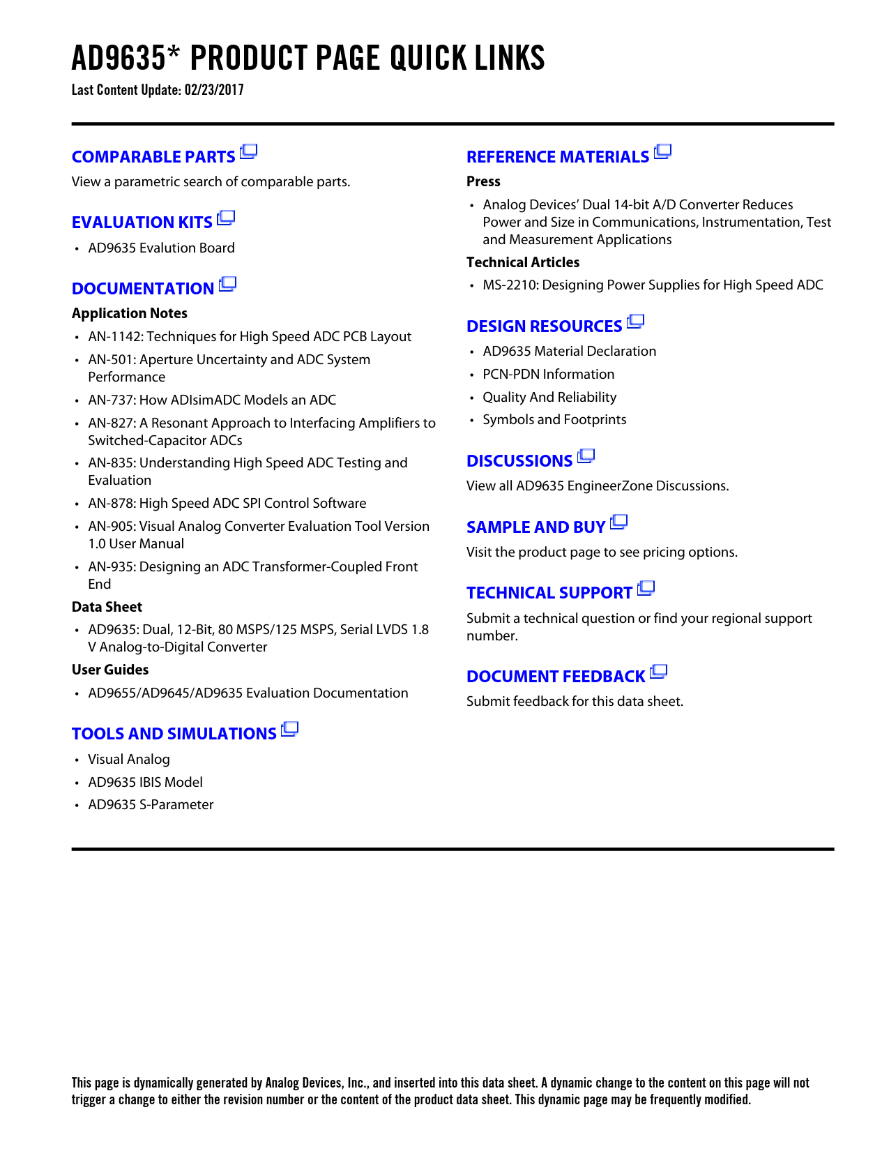 AD9635* PRODUCT PAGE QUICK LINKS Last Content Update: 02/23/2017COMPARABLE PARTSREFERENCE MATERIALS View a parametric search of comparable parts. Press • Analog Devices’ Dual 14-bit A/D Converter Reduces EVALUATION KITS Power and Size in Communications, Instrumentation, Test and Measurement Applications • AD9635 Evalution Board Technical ArticlesDOCUMENTATION • MS-2210: Designing Power Supplies for High Speed ADC Application NotesDESIGN RESOURCES • AN-1142: Techniques for High Speed ADC PCB Layout • AD9635 Material Declaration • AN-501: Aperture Uncertainty and ADC System Performance • PCN-PDN Information • AN-737: How ADIsimADC Models an ADC • Quality And Reliability • AN-827: A Resonant Approach to Interfacing Amplifiers to • Symbols and Footprints Switched-Capacitor ADCs • AN-835: Understanding High Speed ADC Testing and DISCUSSIONS Evaluation View all AD9635 EngineerZone Discussions. • AN-878: High Speed ADC SPI Control Software • AN-905: Visual Analog Converter Evaluation Tool Version SAMPLE AND BUY 1.0 User Manual Visit the product page to see pricing options. • AN-935: Designing an ADC Transformer-Coupled Front End TECHNICAL SUPPORTData Sheet Submit a technical question or find your regional support • AD9635: Dual, 12-Bit, 80 MSPS/125 MSPS, Serial LVDS 1.8 number. V Analog-to-Digital Converter User GuidesDOCUMENT FEEDBACK • AD9655/AD9645/AD9635 Evaluation Documentation Submit feedback for this data sheet. TOOLS AND SIMULATIONS • Visual Analog • AD9635 IBIS Model • AD9635 S-Parameter This page is dynamically generated by Analog Devices, Inc., and inserted into this data sheet. A dynamic change to the content on this page will not trigger a change to either the revision number or the content of the product data sheet. This dynamic page may be frequently modified. Document Outline FEATURES APPLICATIONS GENERAL DESCRIPTION FUNCTIONAL BLOCK DIAGRAM PRODUCT HIGHLIGHTS TABLE OF CONTENTS REVISION HISTORY SPECIFICATIONS DC SPECIFICATIONS AC SPECIFICATIONS DIGITAL SPECIFICATIONS SWITCHING SPECIFICATIONS TIMING SPECIFICATIONS Timing Diagrams ABSOLUTE MAXIMUM RATINGS THERMAL RESISTANCE ESD CAUTION PIN CONFIGURATION AND FUNCTION DESCRIPTIONS TYPICAL PERFORMANCE CHARACTERISTICS AD9635-80 AD9635-125 EQUIVALENT CIRCUITS THEORY OF OPERATION ANALOG INPUT CONSIDERATIONS Input Common Mode Differential Input Configurations VOLTAGE REFERENCE CLOCK INPUT CONSIDERATIONS Clock Input Options Input Clock Divider Clock Duty Cycle Jitter Considerations POWER DISSIPATION AND POWER-DOWN MODE DIGITAL OUTPUTS AND TIMING SDIO/PDWN Pin SCLK/DFS Pin CSB Pin RBIAS Pin OUTPUT TEST MODES SERIAL PORT INTERFACE (SPI) CONFIGURATION USING THE SPI HARDWARE INTERFACE CONFIGURATION WITHOUT THE SPI SPI ACCESSIBLE FEATURES MEMORY MAP READING THE MEMORY MAP REGISTER TABLE Open Locations Default Values Logic Levels Channel-Specific Registers MEMORY MAP REGISTER TABLE MEMORY MAP REGISTER DESCRIPTIONS Device Index (Register 0x05) Transfer (Register 0xFF) Power Modes (Register 0x08) Bits[7:2]—Open Bits[1:0]—Power Mode Enhancement Control (Register 0x0C) Bits[7:3]—Open Bit 2—Chop Mode Bits[1:0]—Open Output Mode (Register 0x14) Bit 7—Open Bit 6—LVDS-ANSI/LVDS-IEEE Option Bits[5:3]—Open Bit 2—Output Invert Bit 1—Open Bit 0—Output Format Output Adjust (Register 0x15) Bits[7:6]—Open Bits[5:4]—Output Driver Termination Bits[3:1]—Open Bit 0—Output Drive Output Phase (Register 0x16) Bit 7—Open Bits[6:4]—Input Clock Phase Adjust Bits[3:0]—Output Clock Phase Adjust Serial Output Data Control (Register 0x21) Resolution/Sample Rate Override (Register 0x100) User I/O Control 2 (Register 0x101) Bits[7:1]—Open Bit 0—SDIO Pull-Down User I/O Control 3 (Register 0x102) Bits[7:4]—Open Bit 3—VCM Power-Down Bits[2:0]—Open APPLICATIONS INFORMATION DESIGN GUIDELINES POWER AND GROUND GUIDELINES CLOCK STABILITY CONSIDERATIONS EXPOSED PAD THERMAL HEAT SLUG RECOMMENDATIONS VCM REFERENCE DECOUPLING SPI PORT OUTLINE DIMENSIONS ORDERING GUIDE