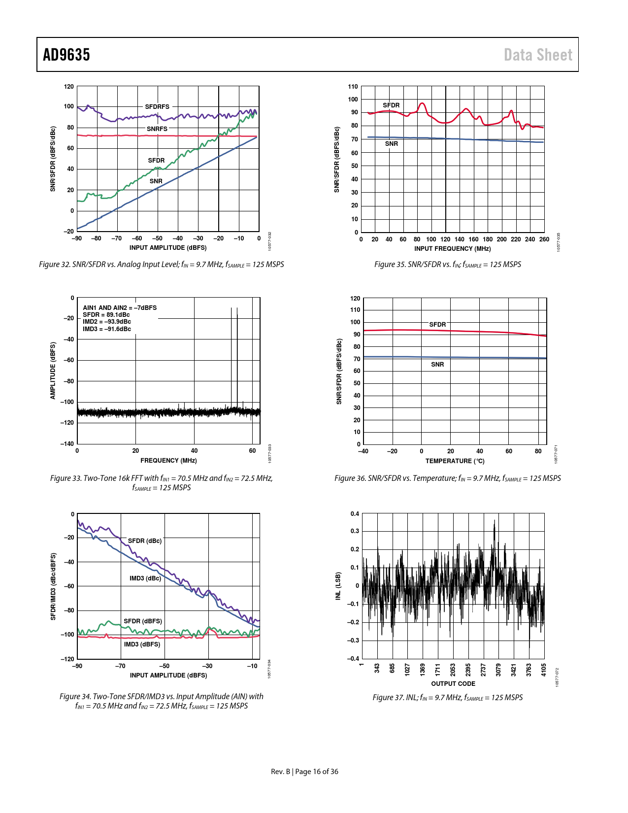 10577- Figure 32. SNR/SFDR vs. Analog Input Level; fIN = 9.7 MHz, fSAMPLE = 125 MSPS Figure 35. SNR/SFDR vs. fIN; fSAMPLE = 125 MSPS