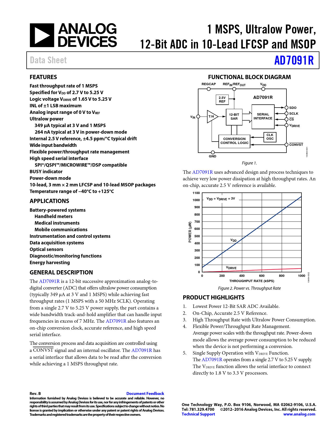 throughput rates (1 MSPS with a 50 MHz SCLK). Operating from a single 2.7 V to 5.25 V power supply, the part contains a 1. Lowest Power 12-Bit SAR ADC Available. wide bandwidth track-and-hold amplifier that can handle input 2. On-Chip, Accurate 2.5 V Reference. frequencies in excess of 7 MHz. The AD7091R also features an 3. High Throughput Rate with Ultralow Power Consumption. on-chip conversion clock, accurate reference, and high speed 4. Flexible Power/Throughput Rate Management. serial interface. Average power scales with the throughput rate. Power-down mode al ows the average power consumption to be reduced The conversion process and data acquisition are controlled using when the device is not performing a conversion. a CONVST signal and an internal oscillator. The AD7091R has 5. Single Supply Operation with VDRIVE Function. a serial interface that al ows data to be read after the conversion The AD7091R operates from a single 2.7 V to 5.25 V supply. while achieving a 1 MSPS throughput rate. The VDRIVE function al ows the serial interface to connect directly to 1.8 V to 3.3 V processors.